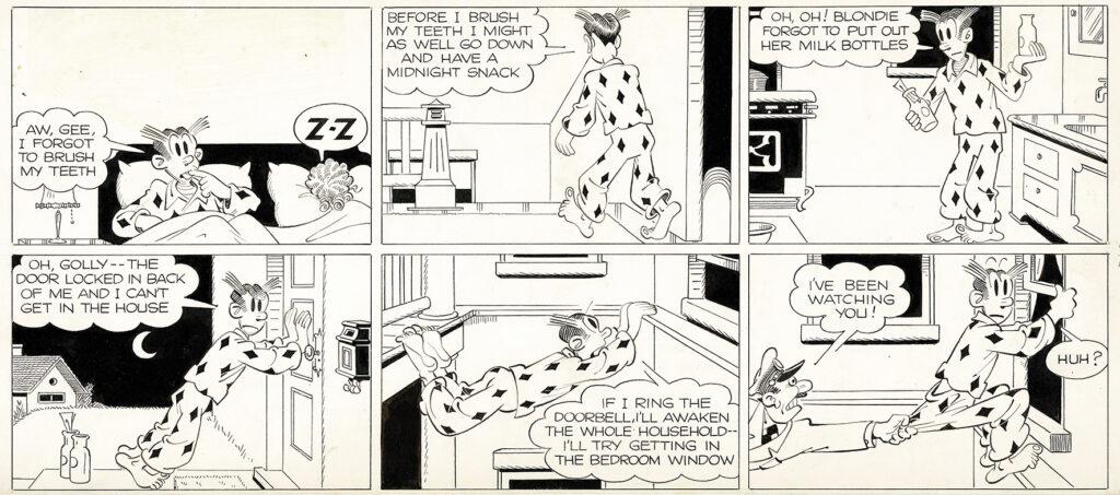 Blondie, demi planche à l’encre de Chine publiée le 24 mars 1946. Dimensions : 48,5 cm x 20 cm.