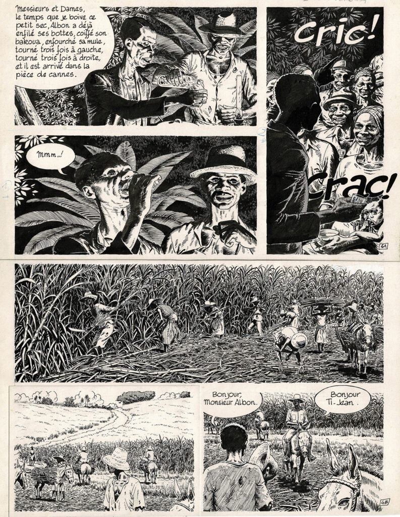 Le sang du flamboyant, planche originale à l’encre de chine pour cet album paru en 1985 chez Casterman. Dimensions : 43 cm x 32,5 cm.