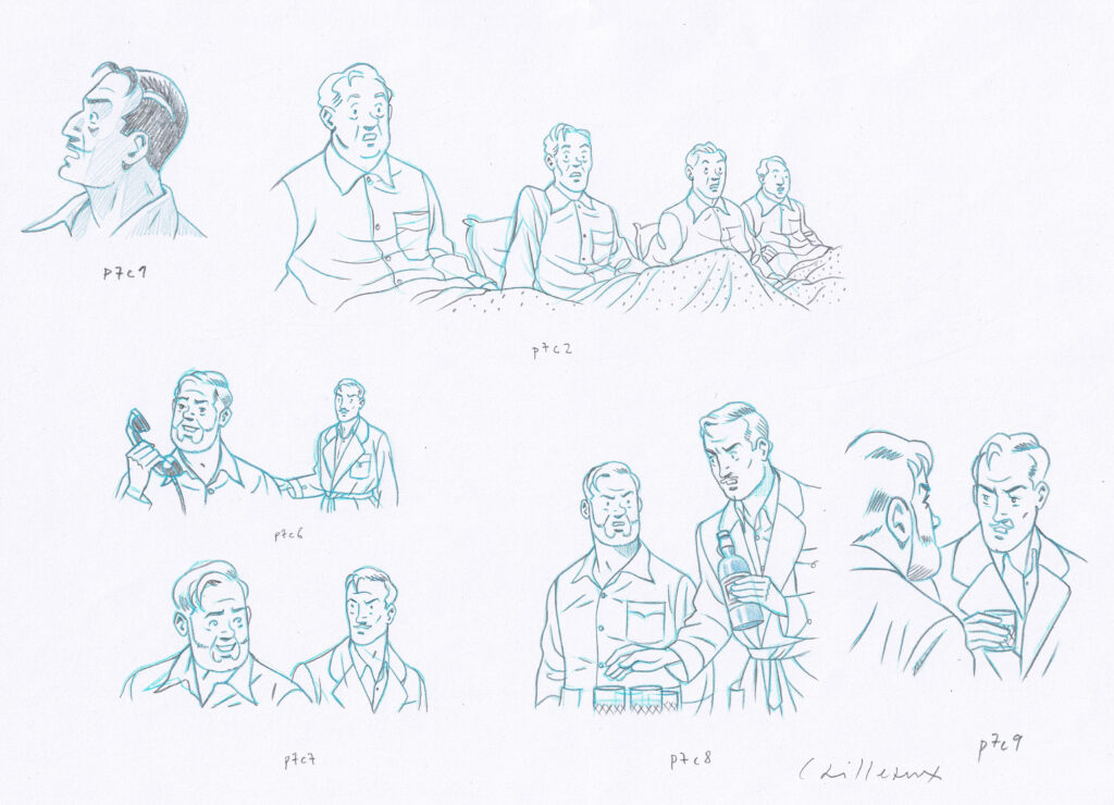 Blake et Mortimer, Le cri du Moloch, étude de personnages originale à la mine de plomb. Dimensions : 29 cm x 21,5 cm.
