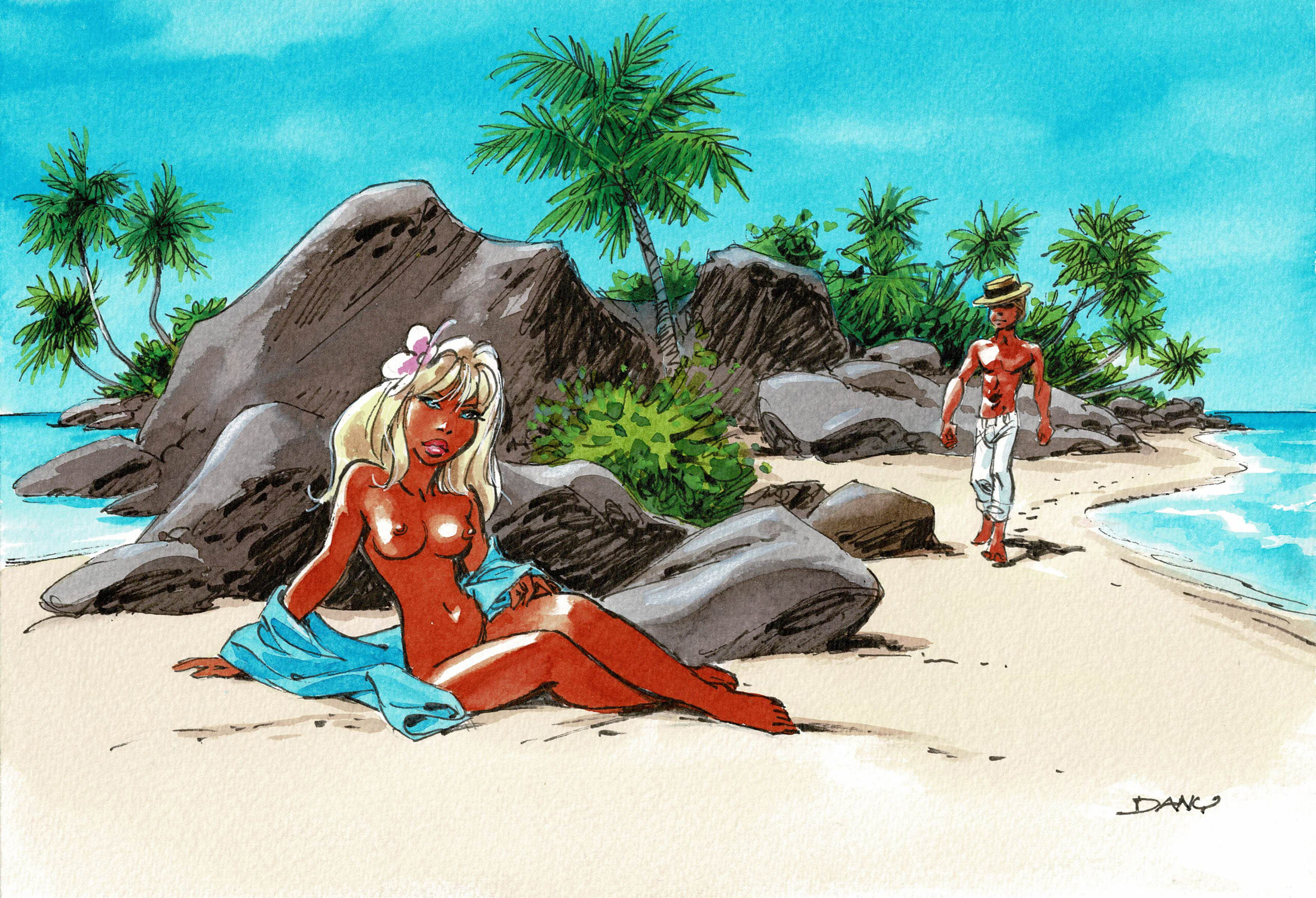 Olivier Rameau, Colombe à la plage, dessin original à l’encre de chine et aux encres de couleurs. Dimensions : 30 cm x 21 cm.