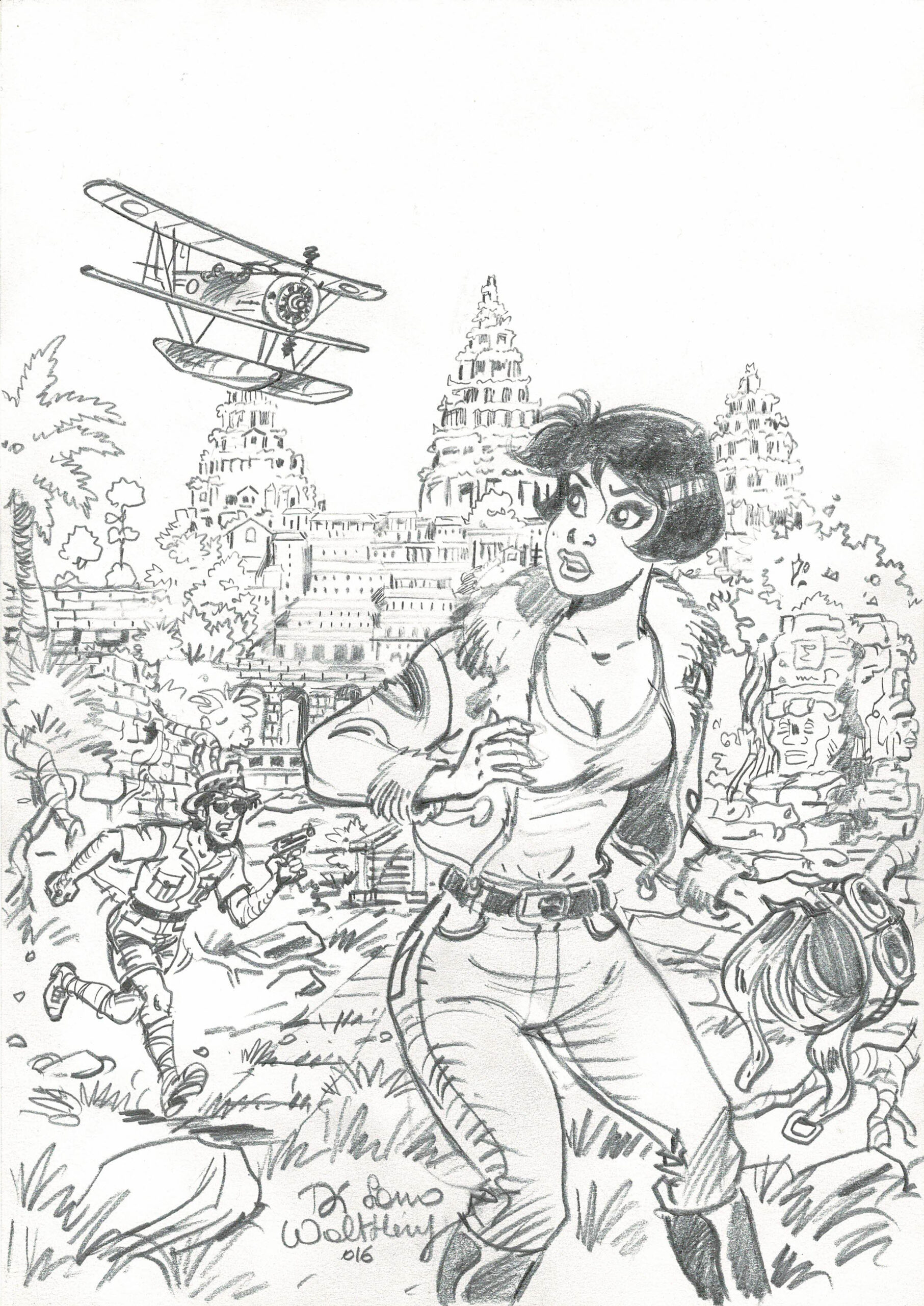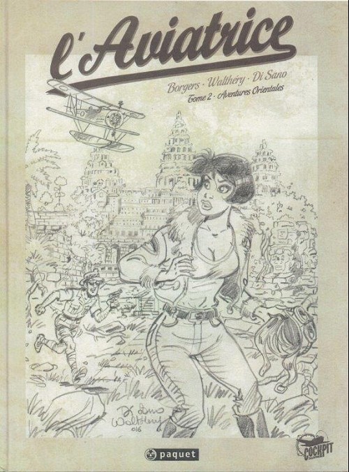 L’aviatrice, Aventures orientales, couverture originale à la mine de plomb pour le tirage de luxe paru en 2016 chez Paquet. Dimensions : 29,5 cm x 21 cm.