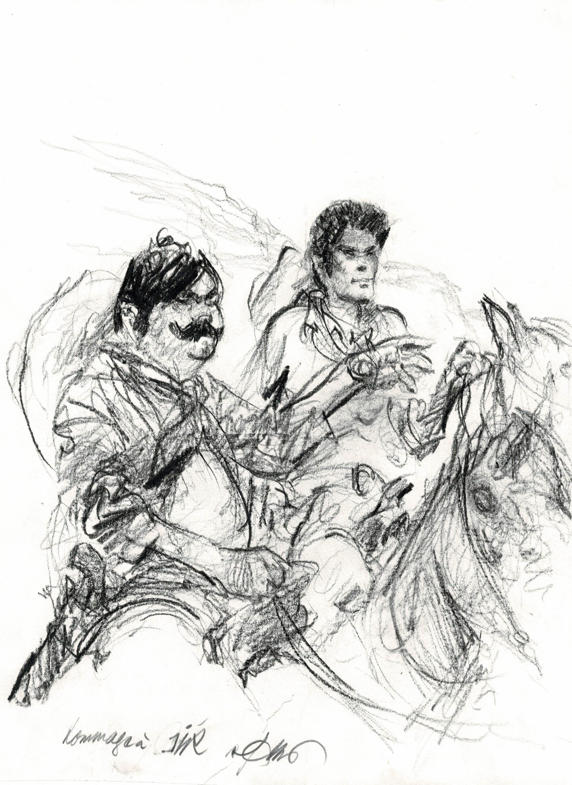 Jerry Spring, dessin original au fusain en hommage à Jijé. Dimensions : 32,5 cm x 24,5 cm.