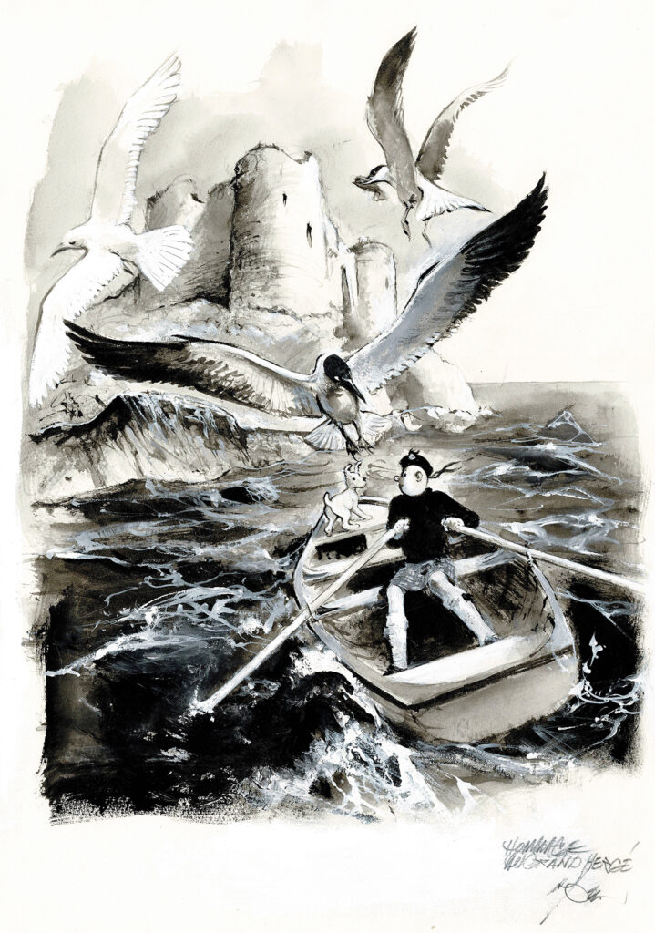 Tintin, dessin original à l’encre de chine et au lavis en hommage à Hergé. Dimensions : 49 cm x 35,5 cm.