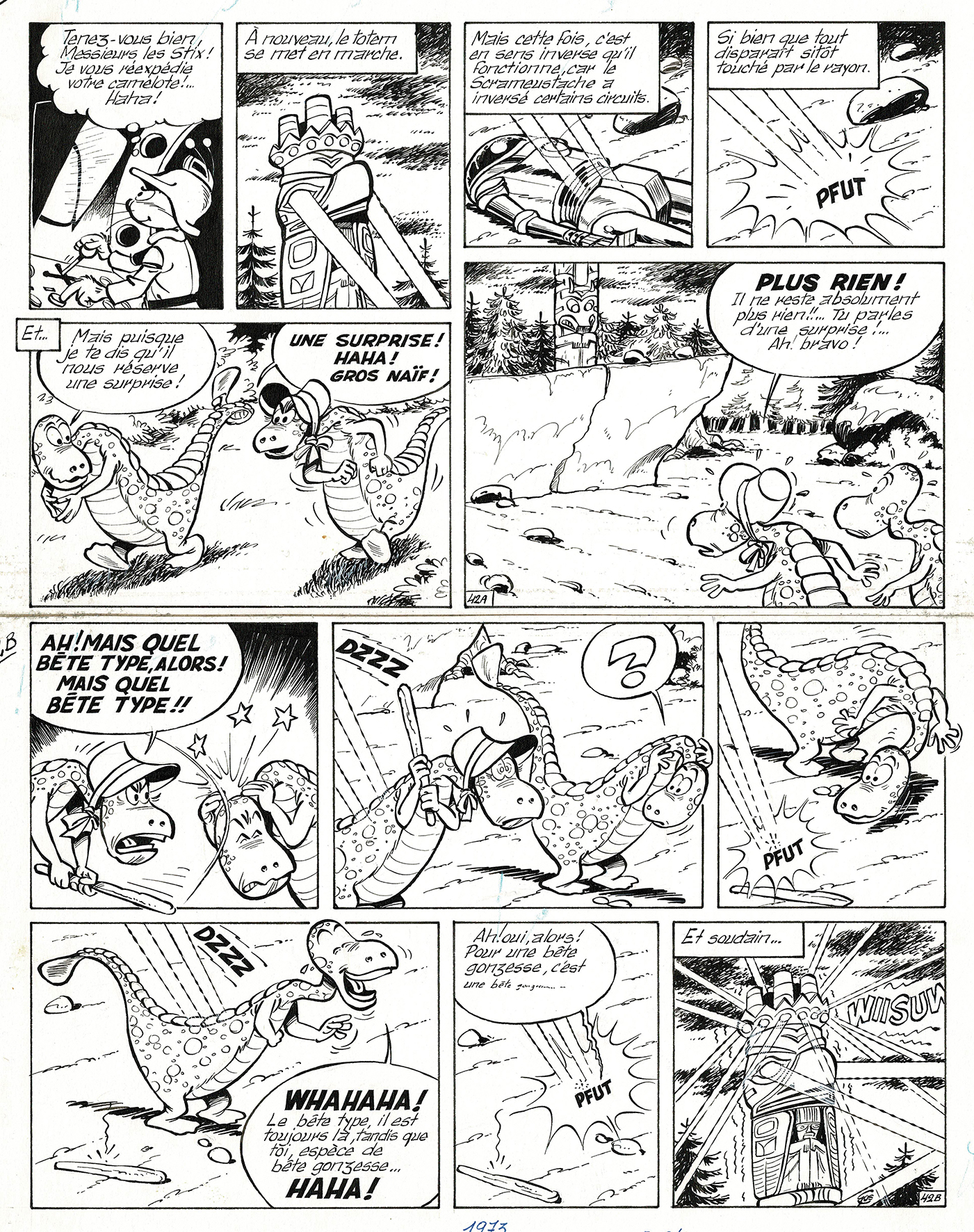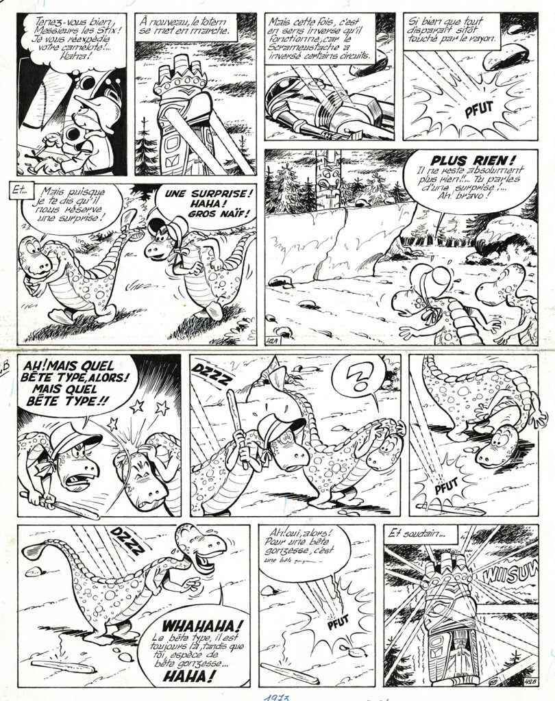 Le Scrameustache, Le totem de l’espace, planche originale à l’encre de chine pour cet album paru en 1977 chez Dupuis. Dimensions : 43,5 cm x 34,5 cm.