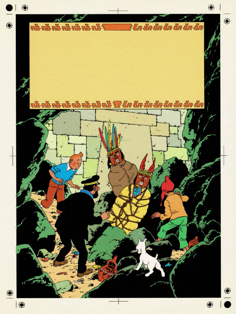 Tintin, Le Temple du Soleil, bleu de coloriage et son film noir pour la couverture de l’album. Dimensions : 41 cm x 32,5 cm.