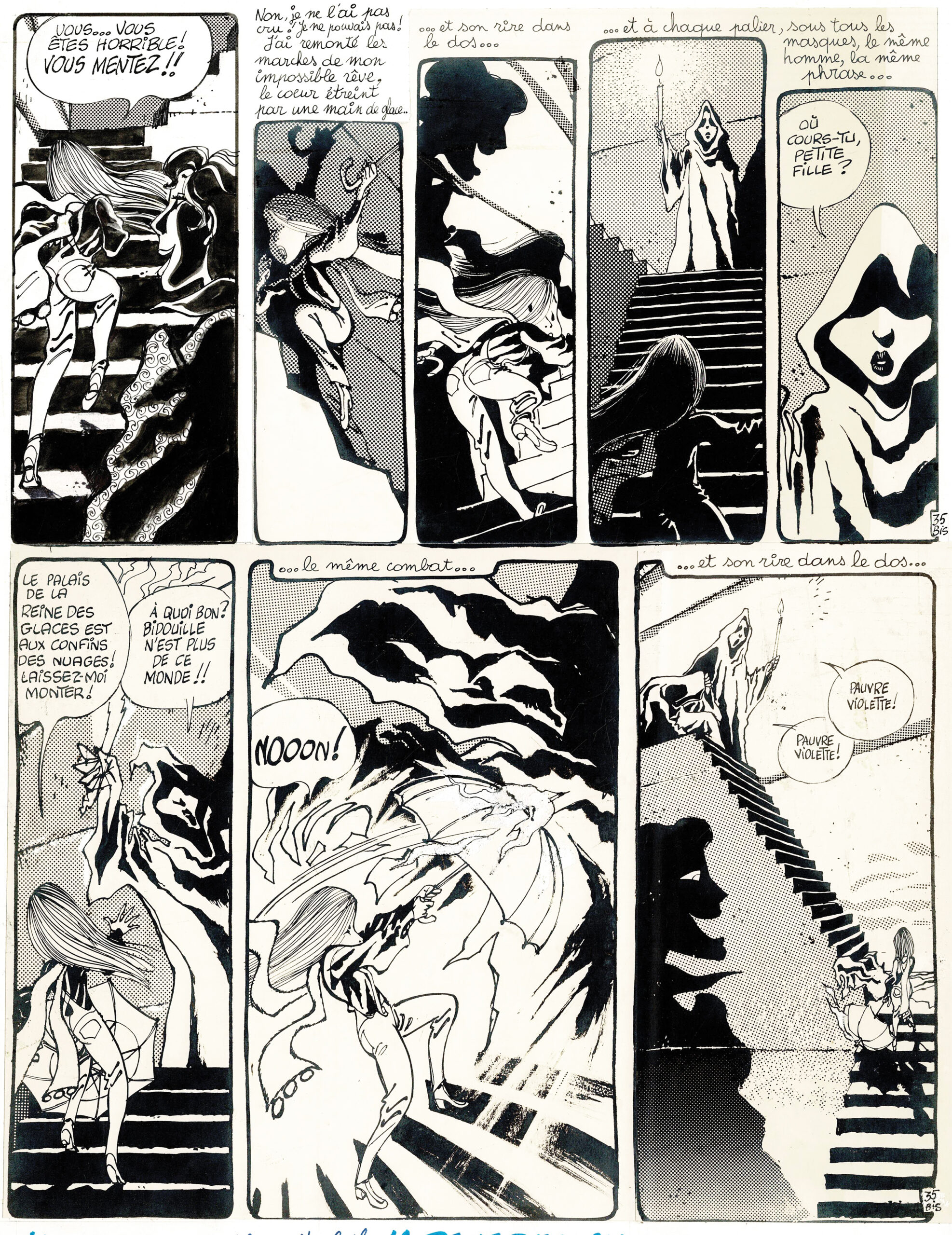 Bidouille et Violette, La Reine des glaces, planche originale à l’encre de chine pour cet album paru en 1984 chez Dupuis. Dimensions : 43 cm x 33,5 cm.