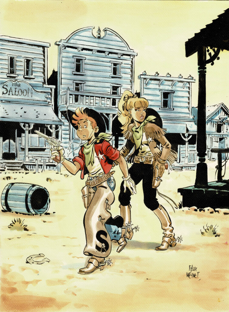 Spirou au Far West, dessin original à l’encre de chine et à l’aquarelle en hommage à Franquin. Dimensions : 40 cm x 30 cm.
