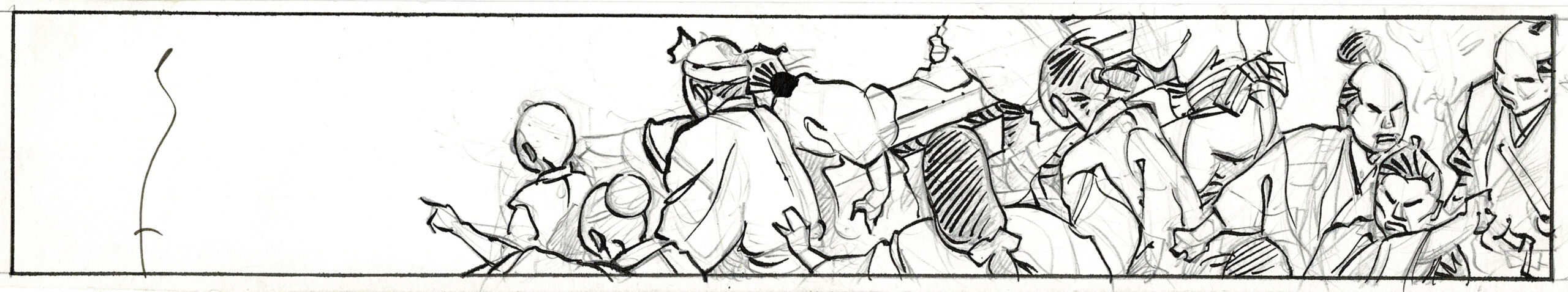 Kogaratsu, strip original à l’encre de chine pour une recherche de case. Dimensions : 32,5 cm x 6 cm.