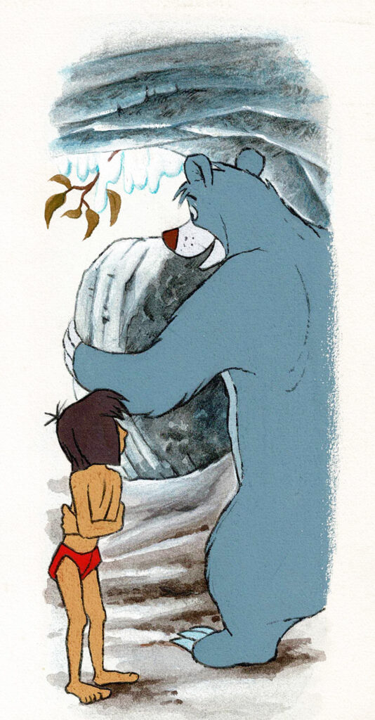 Le Livre de la jungle, Mowgli, dessin original en couleurs directes. Dimensions : 18 cm x 10 cm.