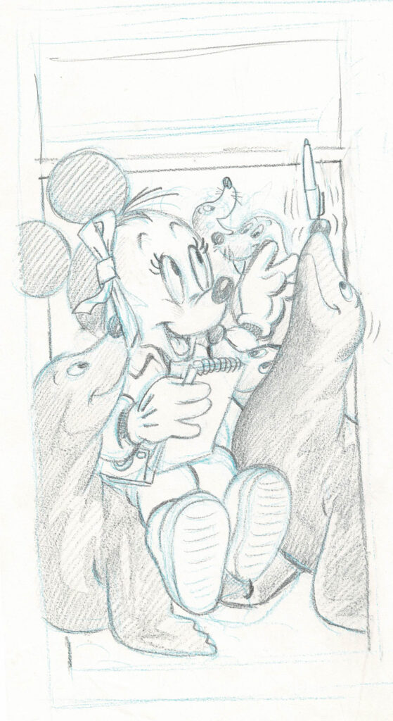Minnie joue avec des otaries, projet de couverture original à la mine de plomb pour le journal Mickey. Dimensions : 32,5 cm x 25 cm.