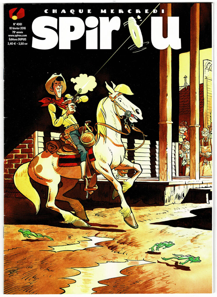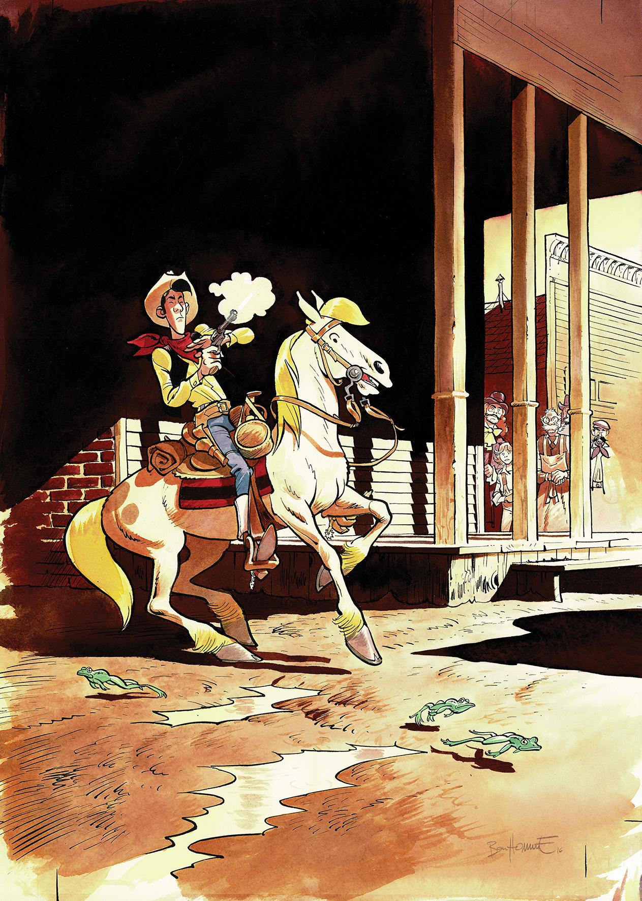 Lucky Luke, couverture originale à l’encre de chine et à l’aquarelle pour le journal Spirou n° 4061 du 10 février 2016. Dimensions : 47,5 cm x 34,5 cm.