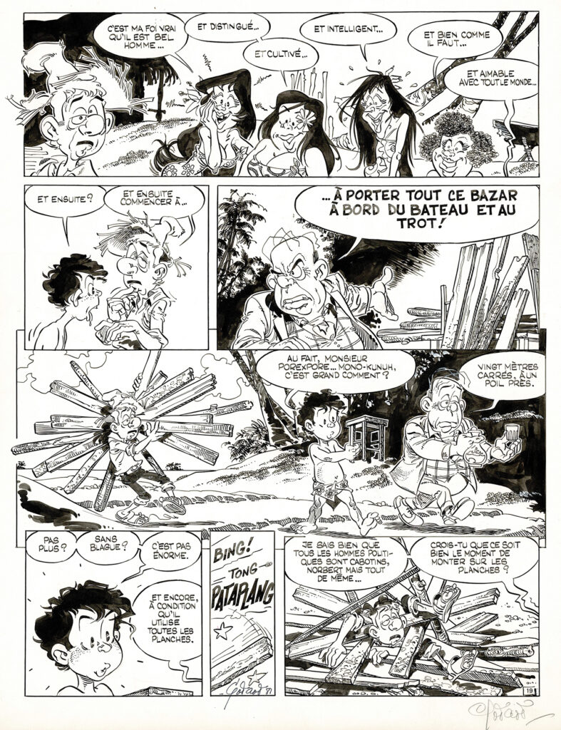 Norbert et Kari, Un empire sur pilotis, planche originale à l’encre de chine. Dimensions : 50 cm x 39,5 cm.