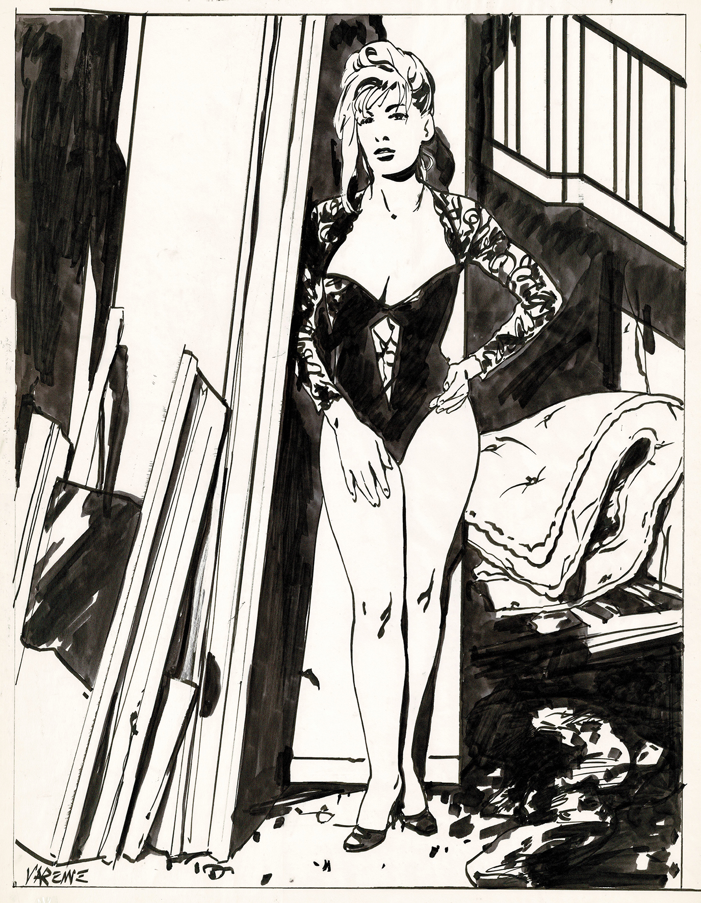 La belle en déshabillé, dessin original très grand format au feutre fin. Dimensions : 65 cm x 50 cm.
