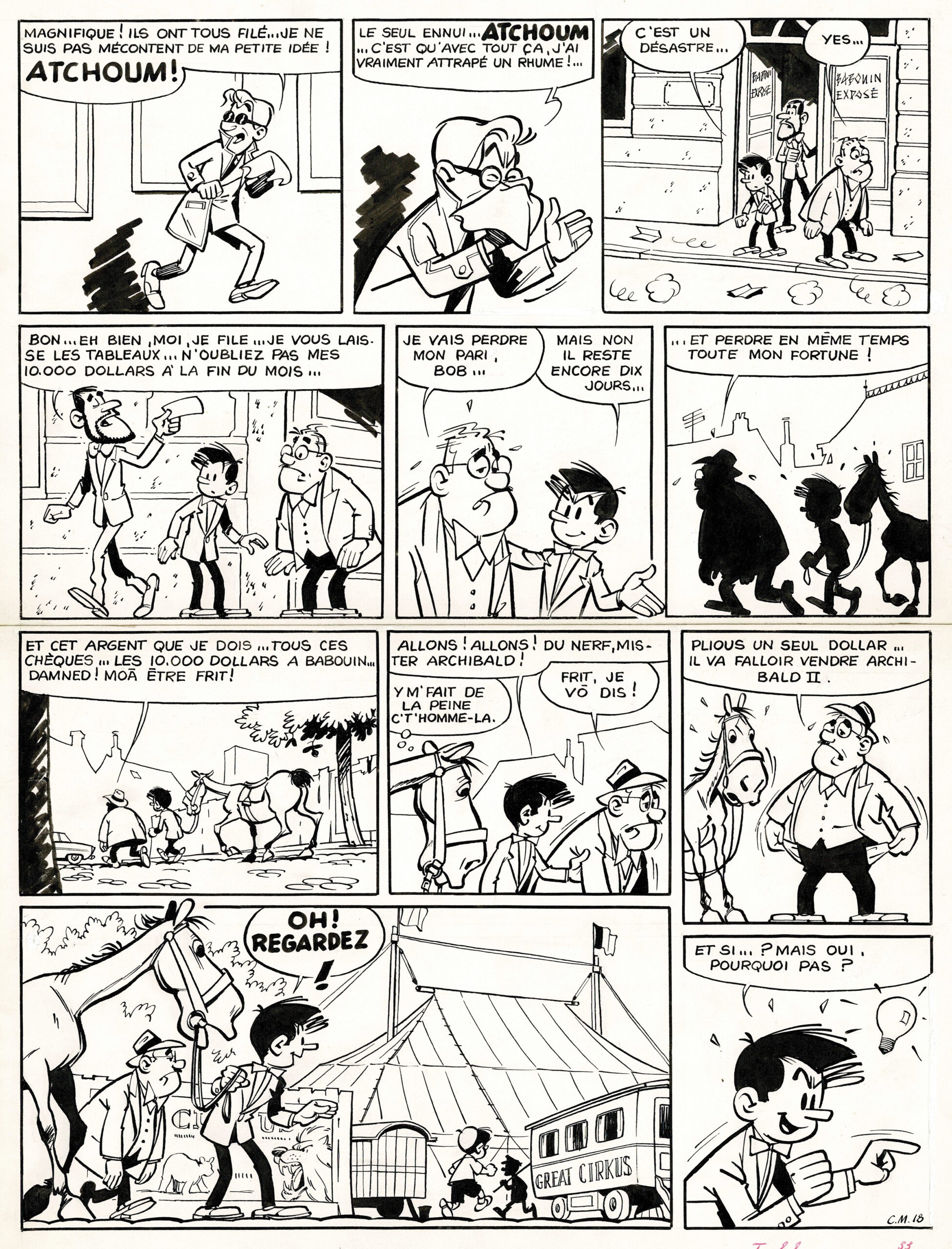 Bob Binn, La course aux millions, planche originale à l’encre de chine parue dans le journal Tintin en 1961. Dimensions : 42 cm x 31,5 cm.
