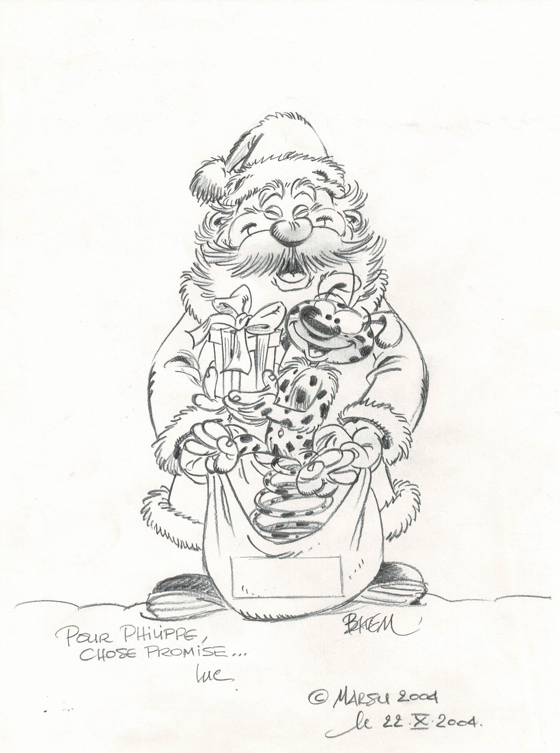 Le Marsupilami et le Père Noël, dessin original à la mine de plomb. Dimensions : 30,5 cm x 22 cm.