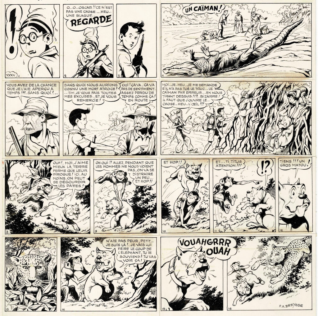 Oscar Hamel et Isidore, L’oncle du Tchad, planche originale à l’encre de chine pour cet album paru en 1952 chez Fleurus. Dimensions : 27,5 cm x 25 cm.