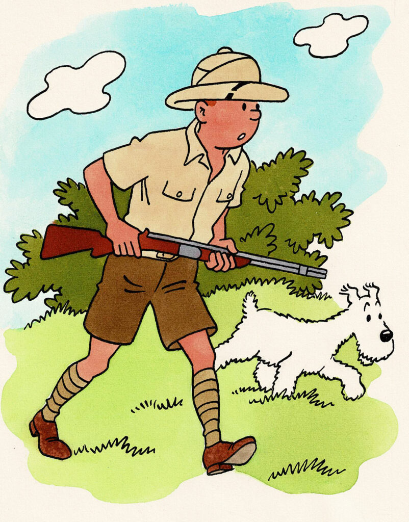 Tintin au Congo, dessin original à l’encre de chine et à l’aquarelle. Dimensions : 24 cm x 20 cm.