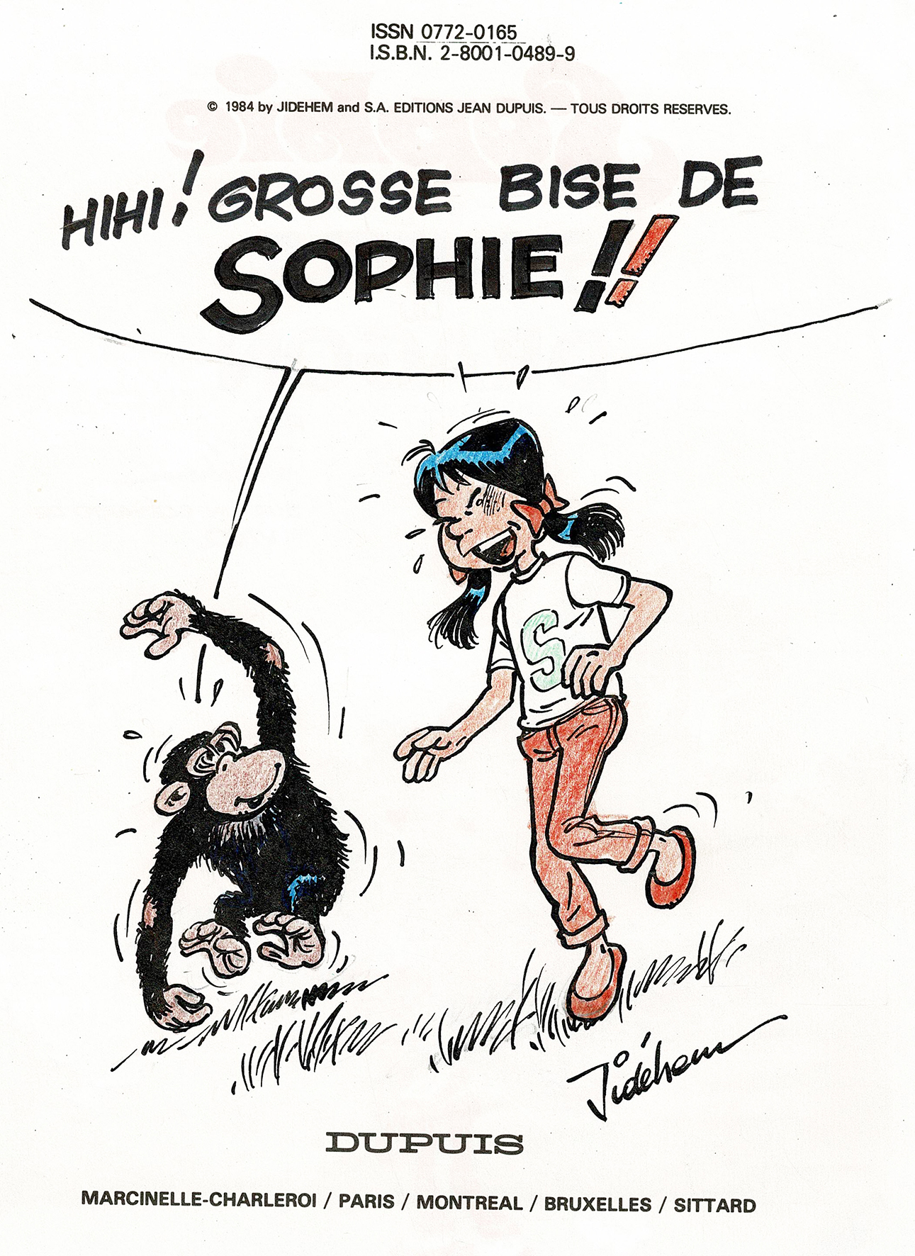 Sophie, dessin original à l’encre de chine et aux crayons de couleurs réalisé sur une page de titre d’album.