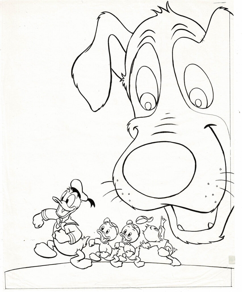 Donald et ses neveux, projet de couverture à l’encre de chine pour le journal Mickey. Dimensions : 32,5 cm x 24 cm.