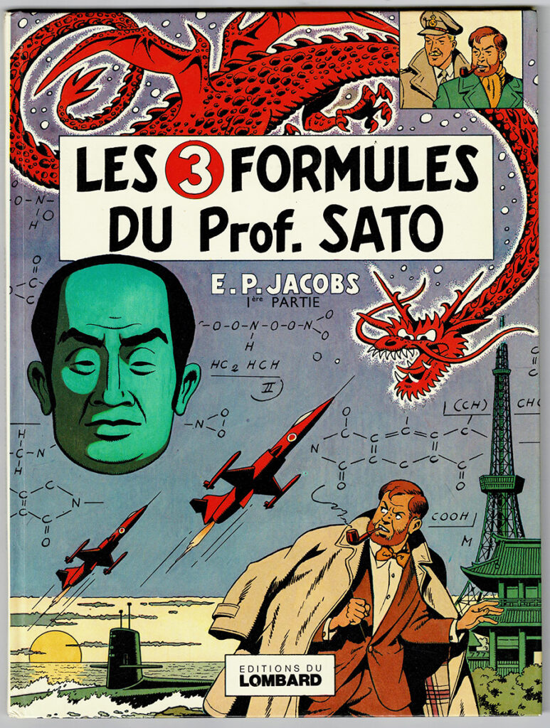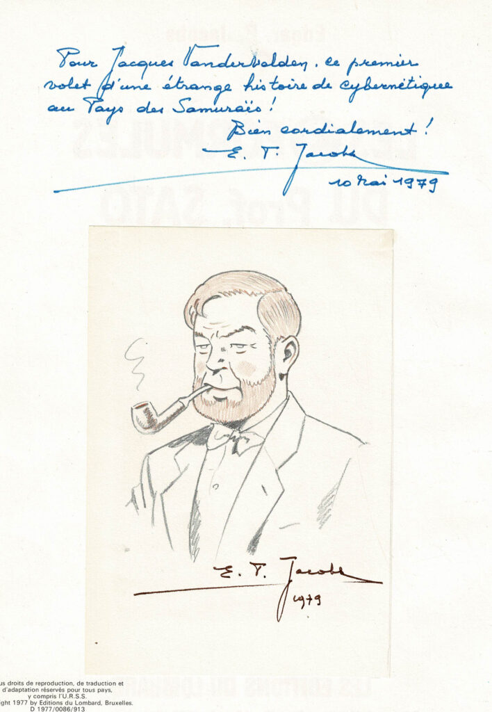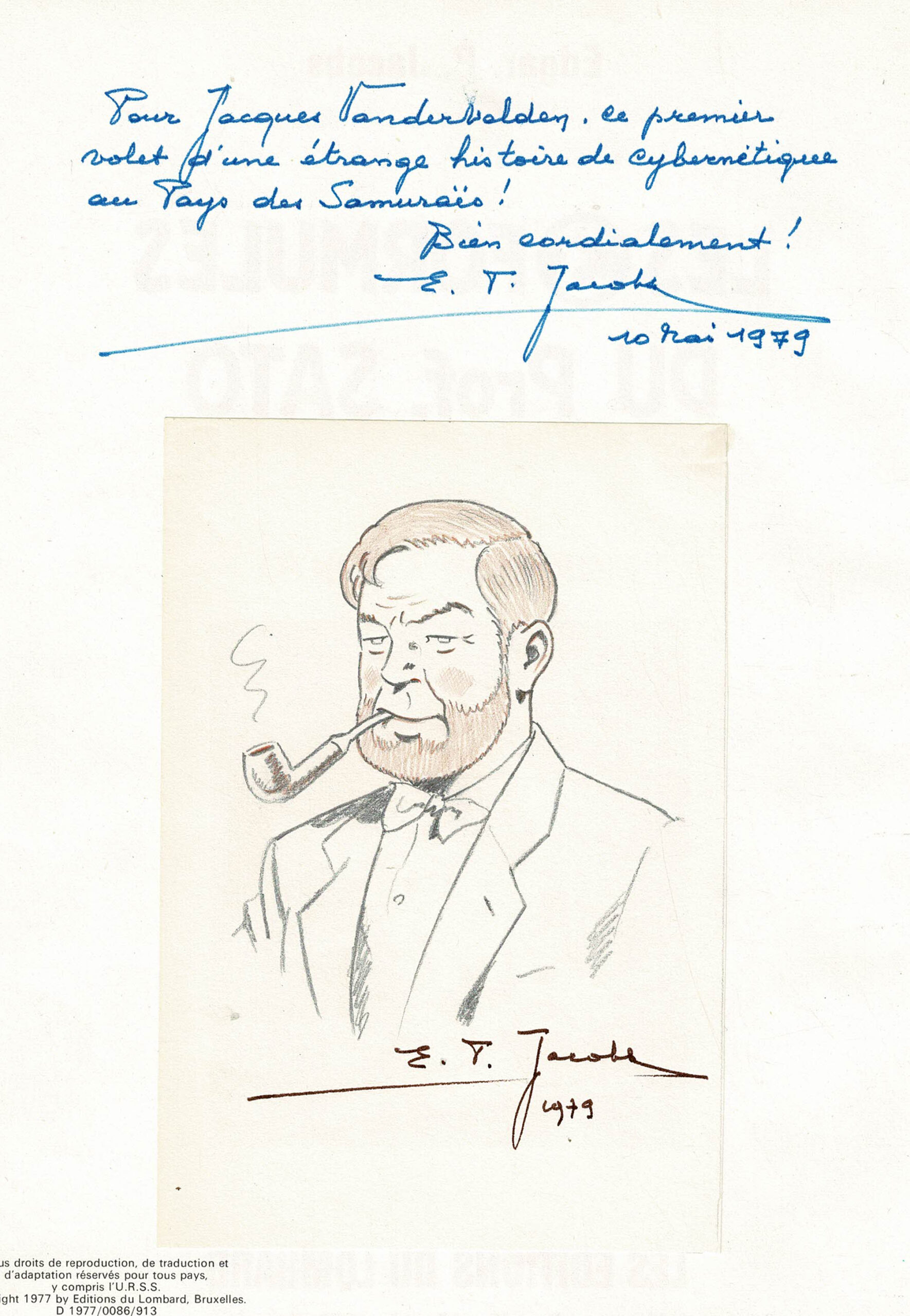 Blake et Mortimer, Les 3 formules du Prof. Sato T1 en édition originale, agrémenté d’un envoi de 3 lignes signé et d’un dessin original à la mine de plomb représentant Mortimer également signé, les deux datés de 1979. Album en très très bon état.