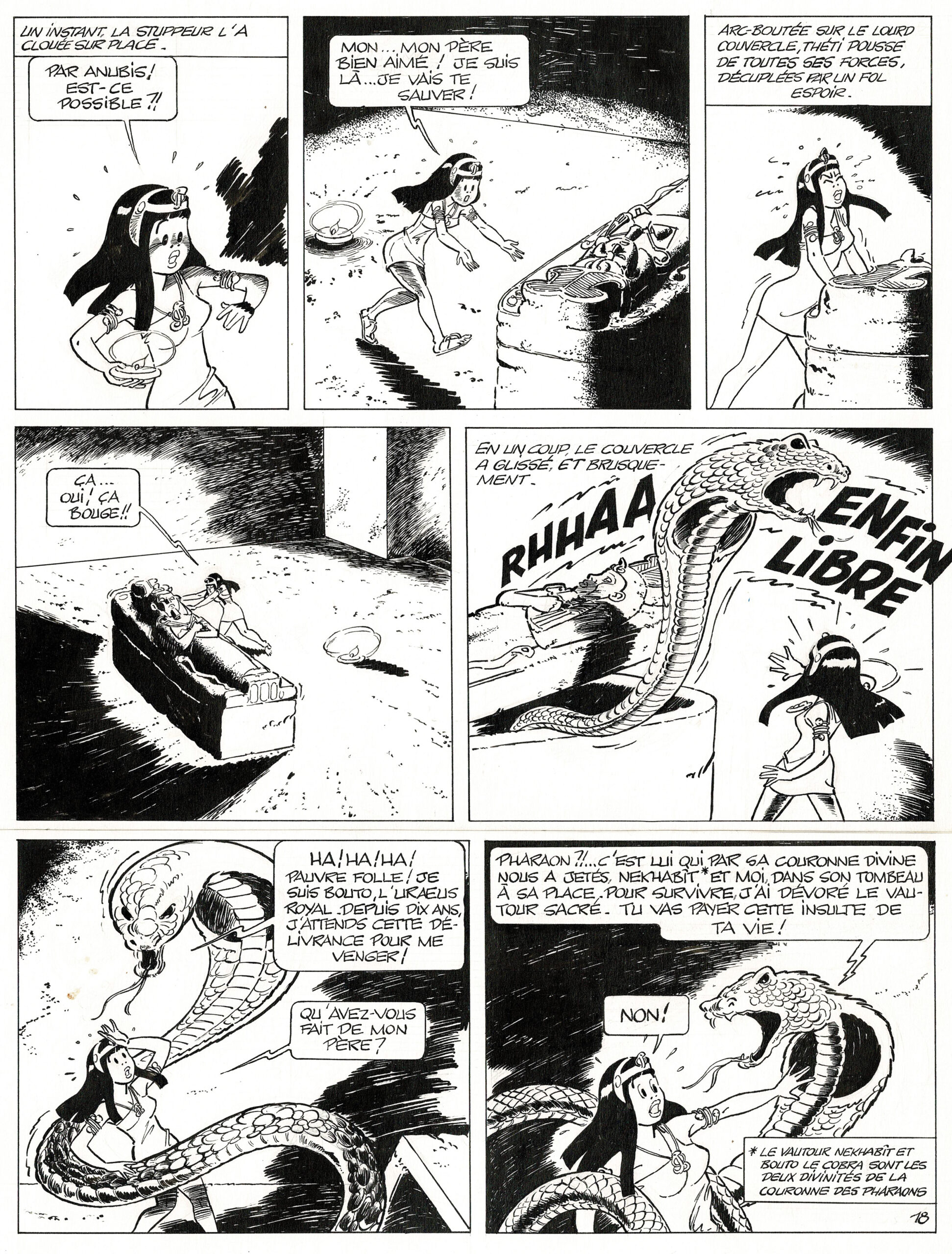 Papyrus, Le tombeau du Pharaon, planche originale à l’encre de chine pour cet album paru en 1981 chez Dupuis. Dimensions : 45,5 cm x 32,5 cm.