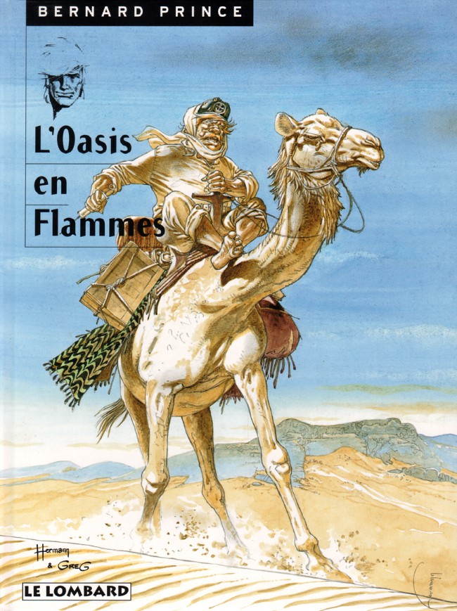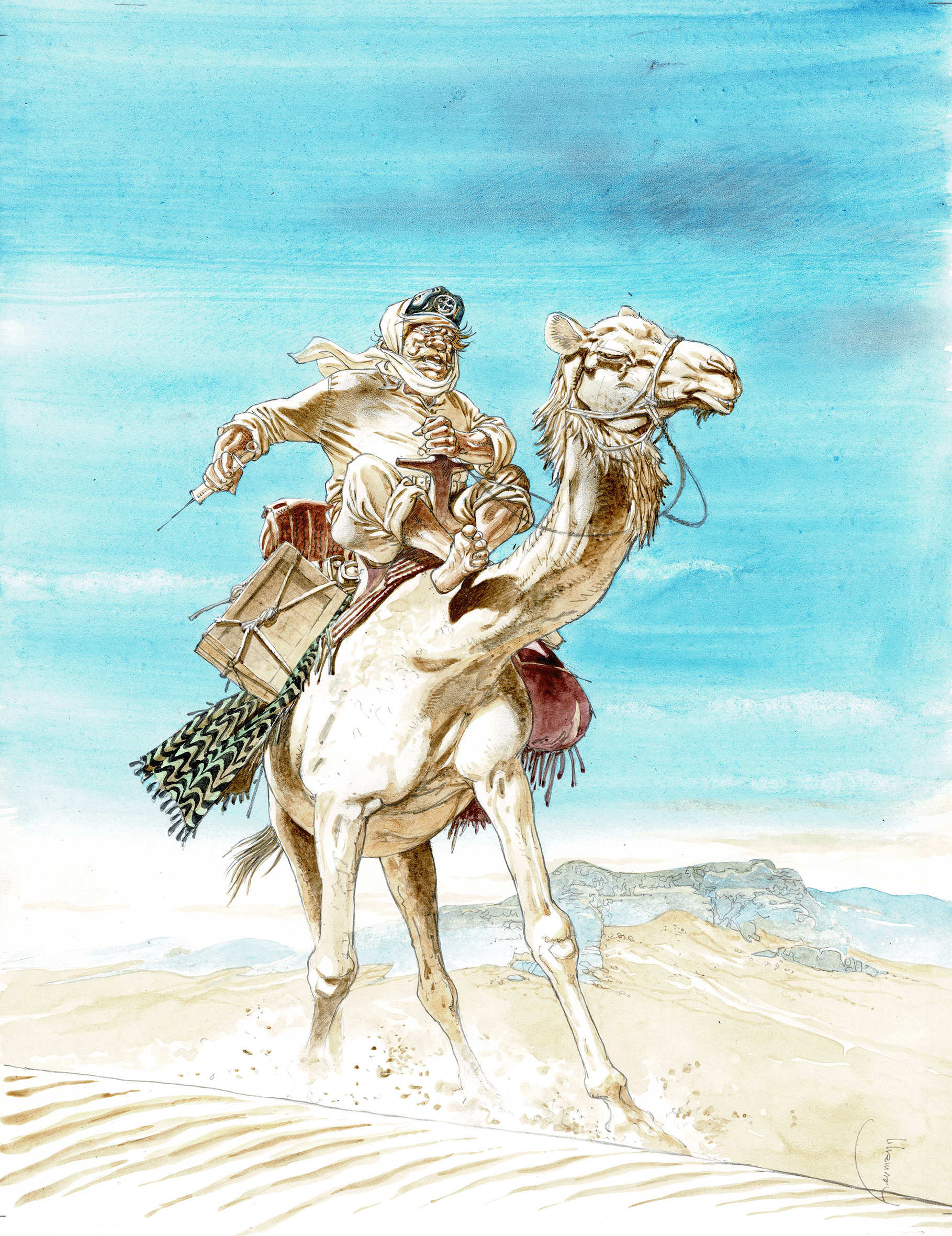 Bernard Prince, L’Oasis en flammes, couverture originale à l’encre de chine et à l’aquarelle pour cet album paru en 1998 au Lombard. Dimensions : 38 cm x 25,5 cm.