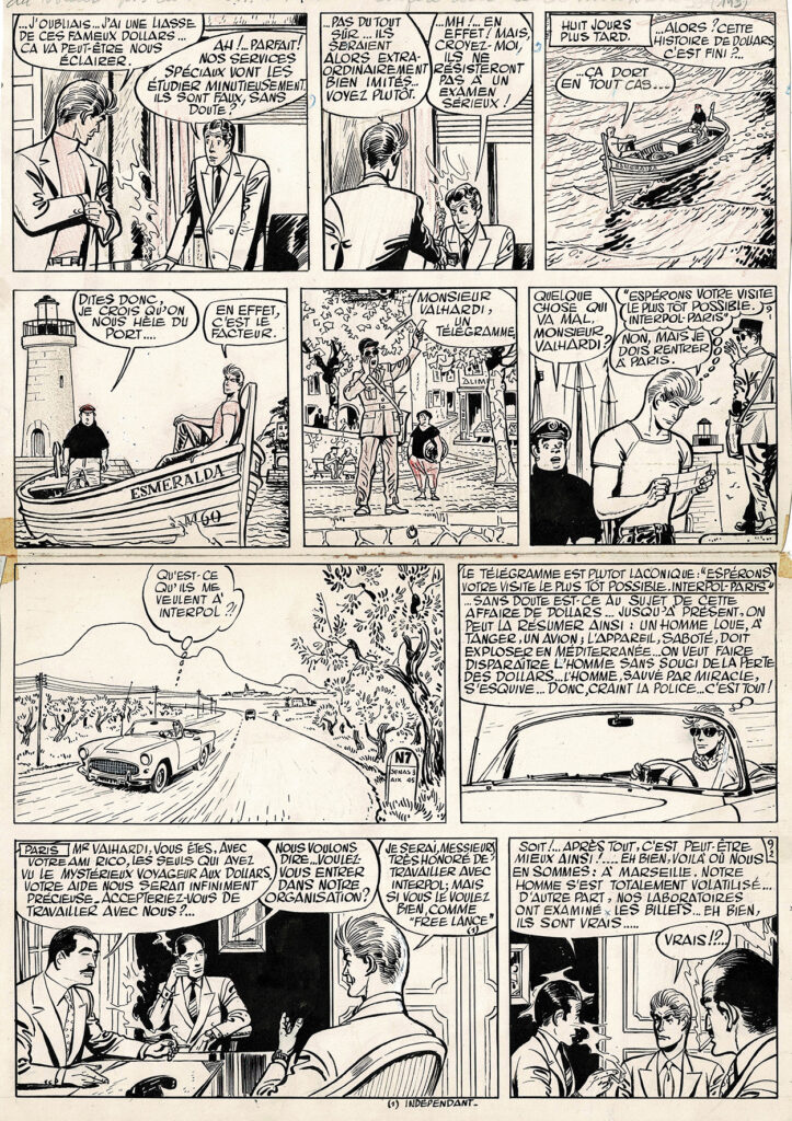 Valhardi, Le secret de Neptune, planche originale à l’encre de chine pour cet album paru en 1961 chez Dupuis. Dimensions : 46 cm x 31,5 cm.