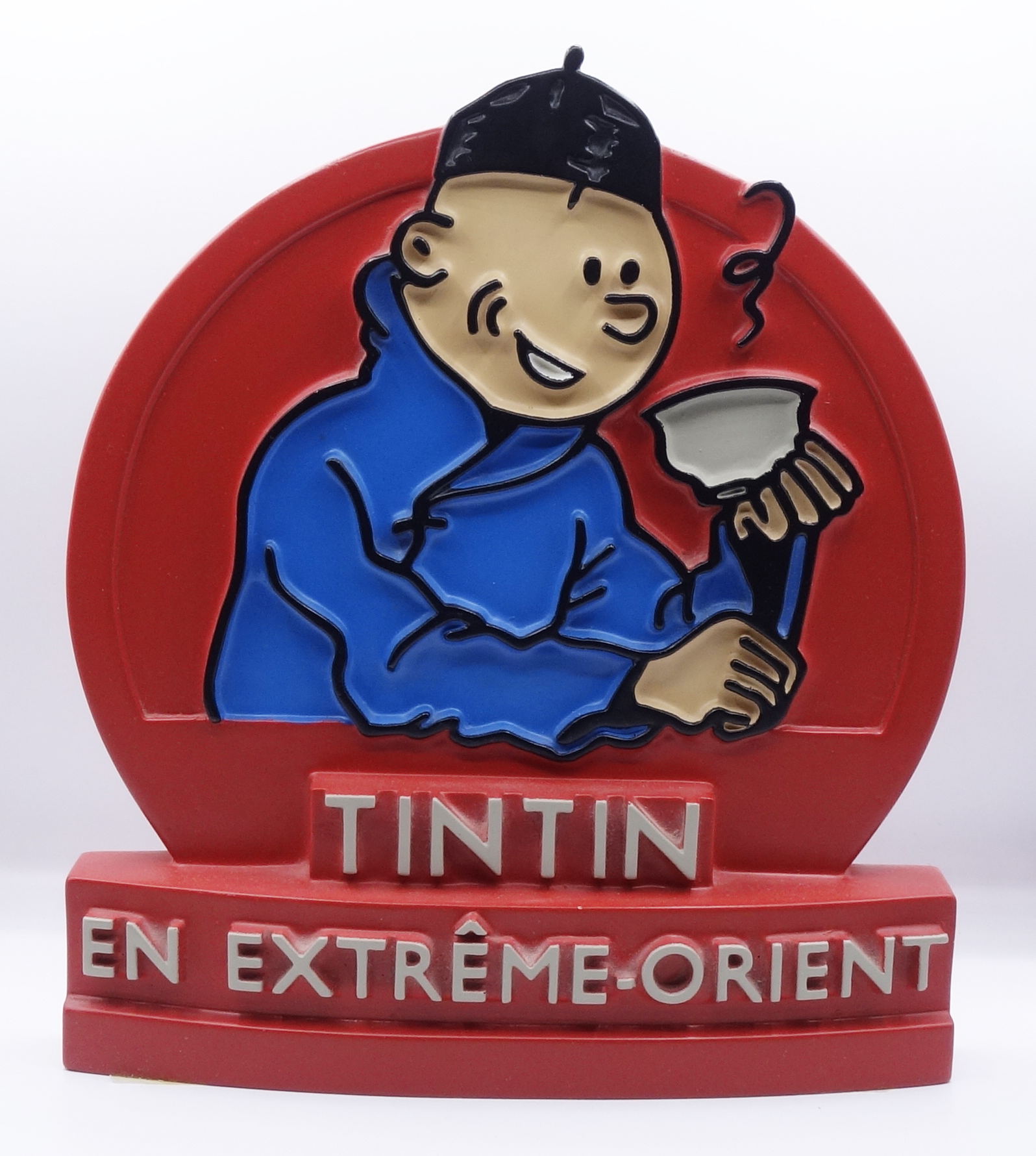 PIXI REGOUT : Tintin, prend le thé en Extrême-Orient (40503), Le Lotus bleu, stèle ou bas relief en résine, 1991, 28 cm. Rare.