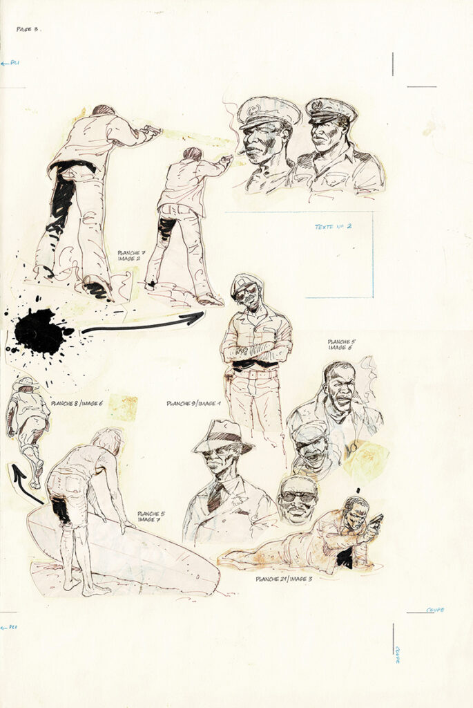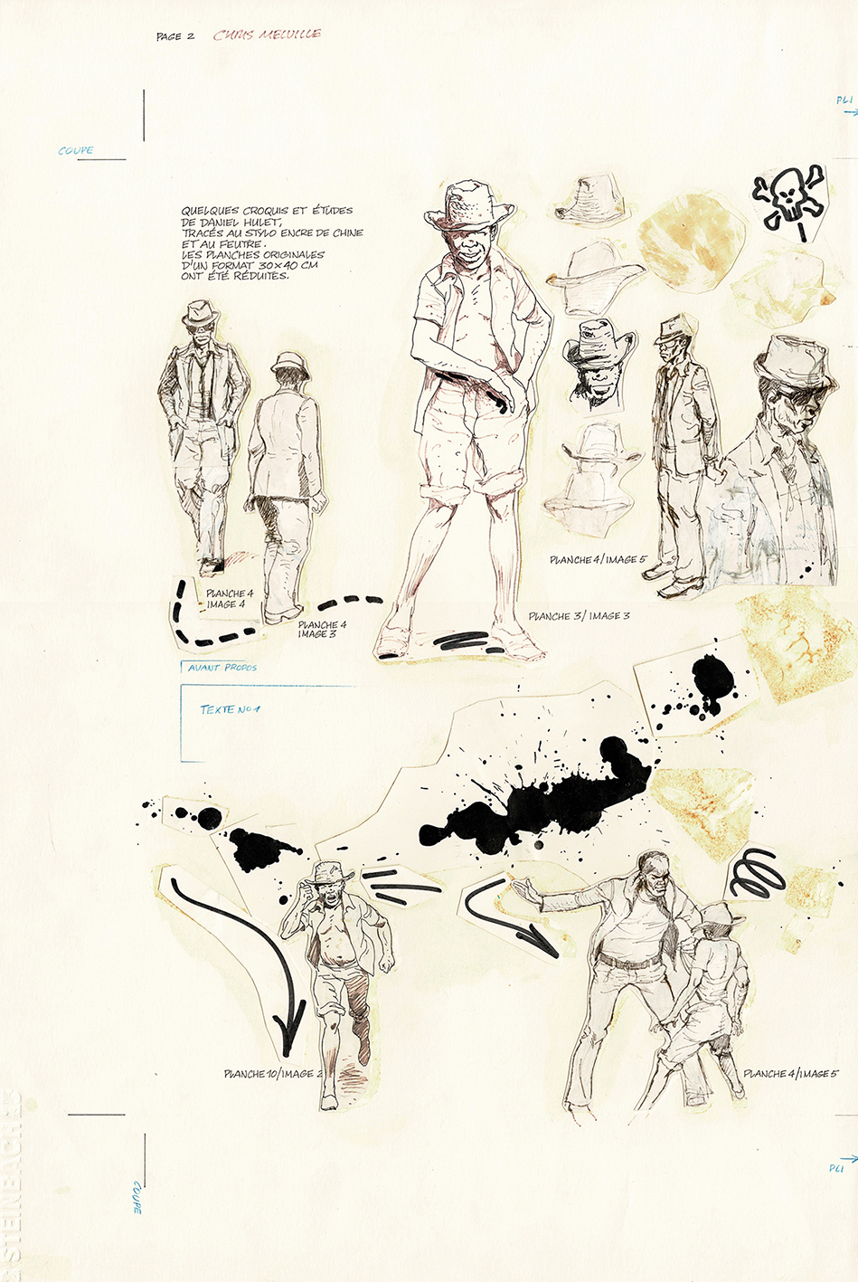 Chris Melville, ensemble de 2 planches originales d’étude de personnages à l’encre de chine. Dimensions : 2x 55 cm x 36,5 cm.