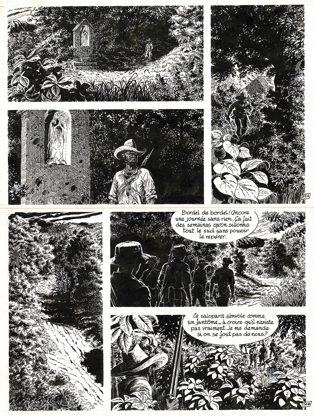 Le Sang du Flamboyant, planche originale à l’encre de chine. Dimensions : 43 cm x 32,5 cm.