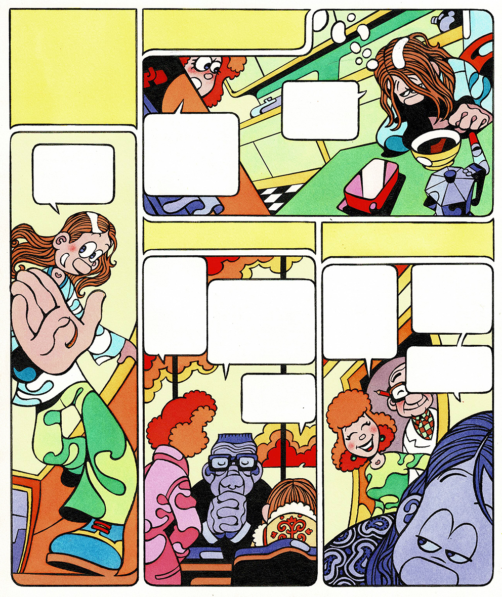 Sur la route des 70’s, planche originale en couleurs directes. Dimensions : 27 cm x 23 cm.