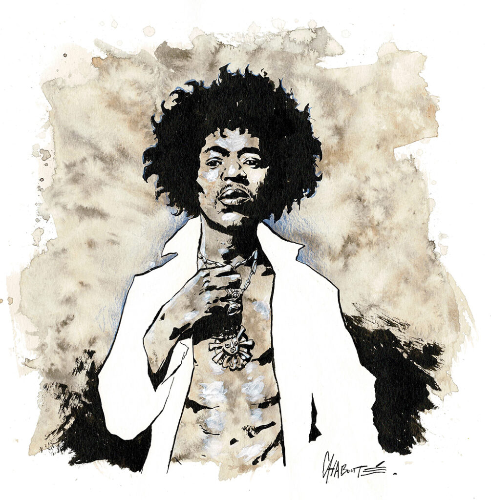 Jimi Hendrix, dessin original en couleurs directes. Dimensions : 30 cm x 30 cm.