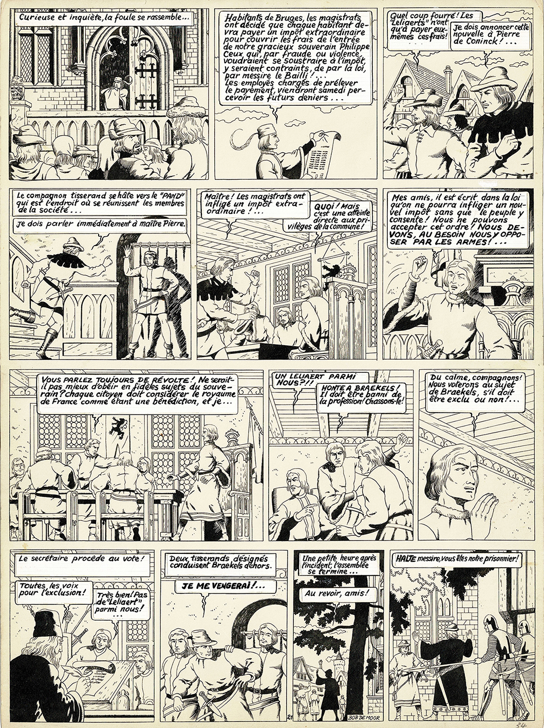 Le lion de Flandre, planche originale à l’encre de chine pour cet album paru en 1976 chez Deligne. Dimensions : 40,5 cm x 30 cm.