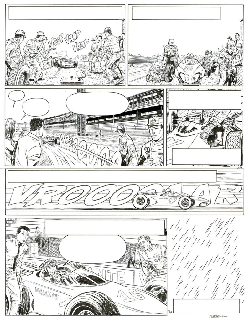 Michel Vaillant, Dans l’enfer d’Indianapolis, planche originale à l’encre de chine. Dimensions : 57 cm x 42 cm.