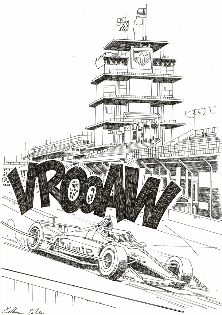 Michel Vaillant, dessin original à l’encre de chine réalisé pour un ex-libris. Dimensions : 42 cm x 29,5 cm.
