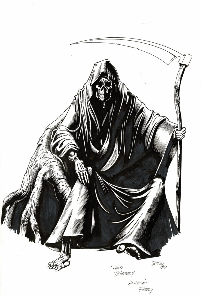 La grande faucheuse, dessin original à l’encre de chine. Dimensions : 42 cm x 29,5 cm.