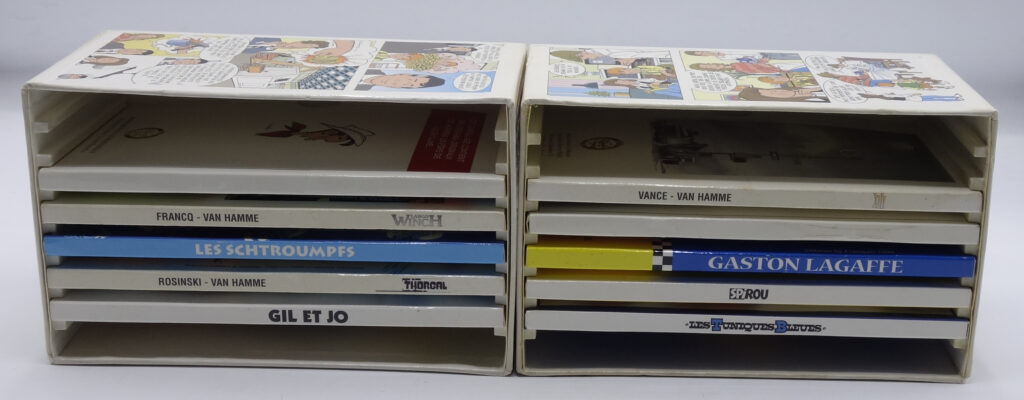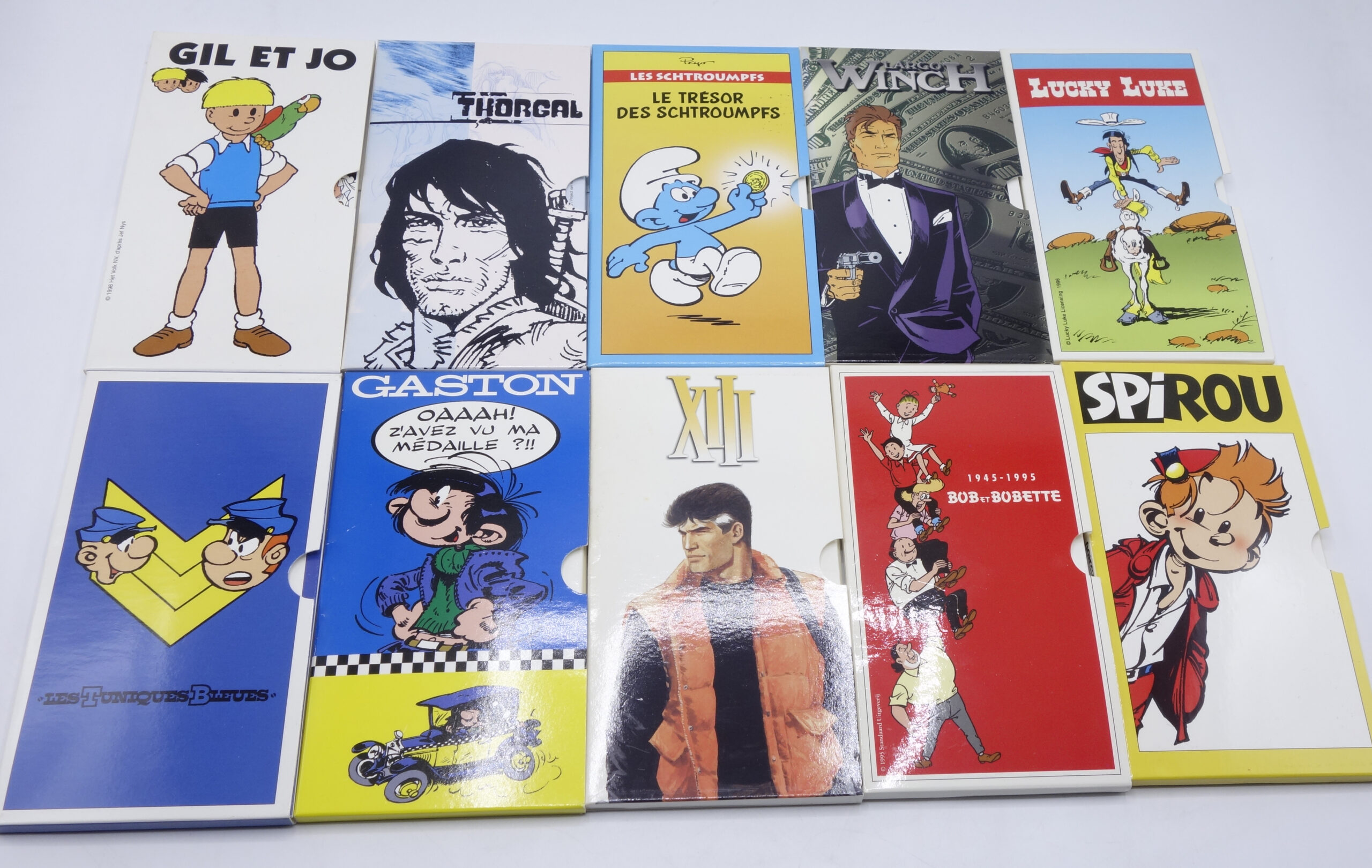 Ensemble de 10 pièces sur le thème de la BD avec leur présentoir (Monnaie Royale de Belgique), (Lambil, Morris, Franquin, Francq, Peyo, Rosinski, Vandersteen, Vance, etc…).
