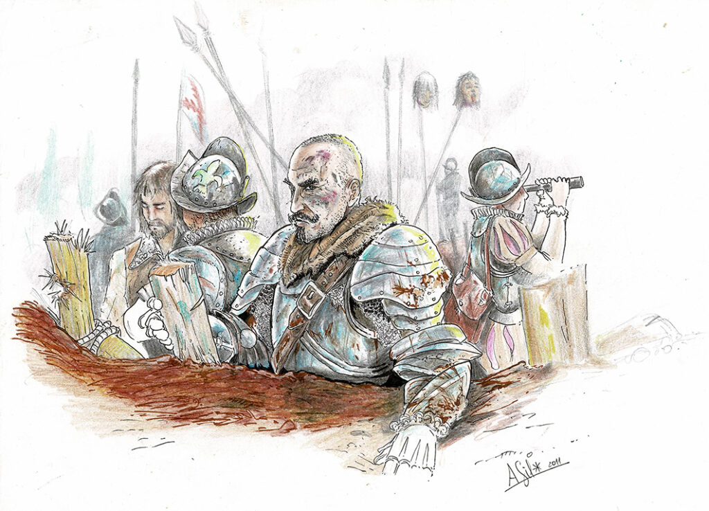 La bataille d’Alkmaar, dessin original à l’encre de chine et à l’aquarelle. Dimensions : 29,5 cm x 21 cm.