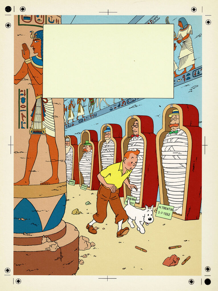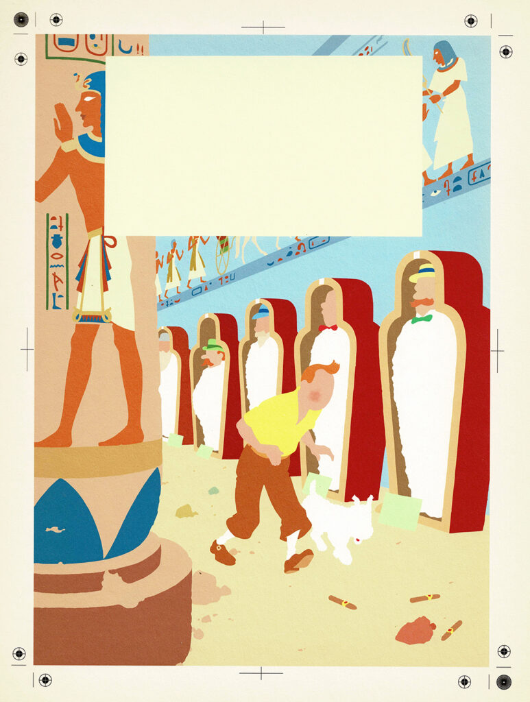 Tintin, Les cigares du Pharaon, bleu de coloriage et son film noir pour la couverture de l’album. Dimensions : 41 cm x 32,5 cm.