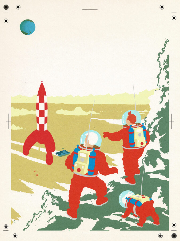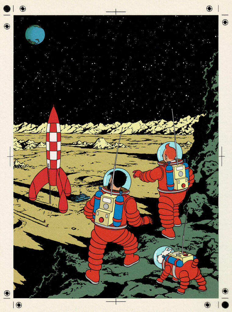 Tintin, On a marché sur la Lune, bleu de coloriage et son film noir pour la couverture de l’album. Dimensions : 41 cm x 32,5 cm.