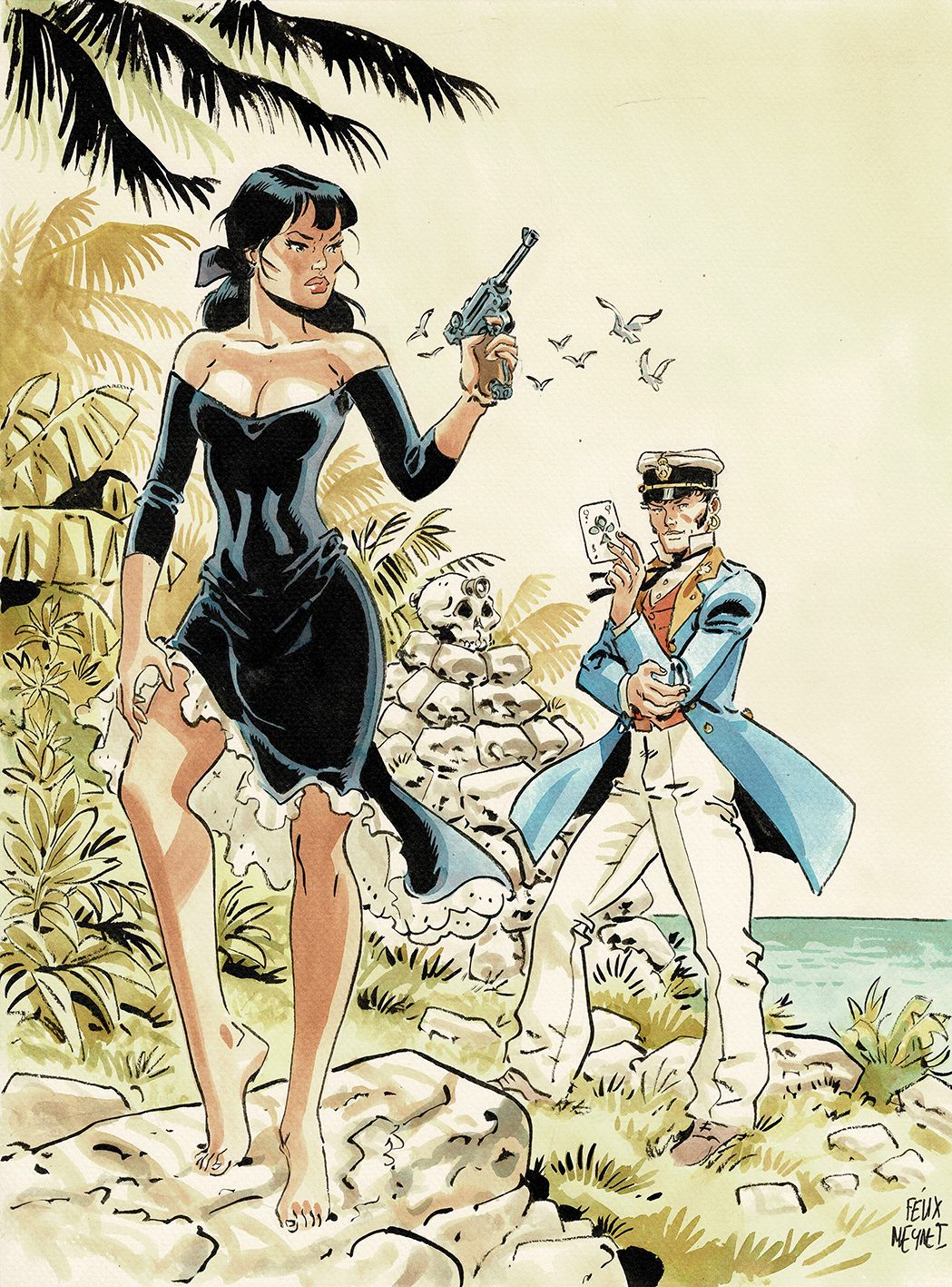 Corto Maltese, dessin original à l’encre de chine et à l’aquarelle en hommage à Hugo Pratt. Dimensions : 40 cm x 30 cm.