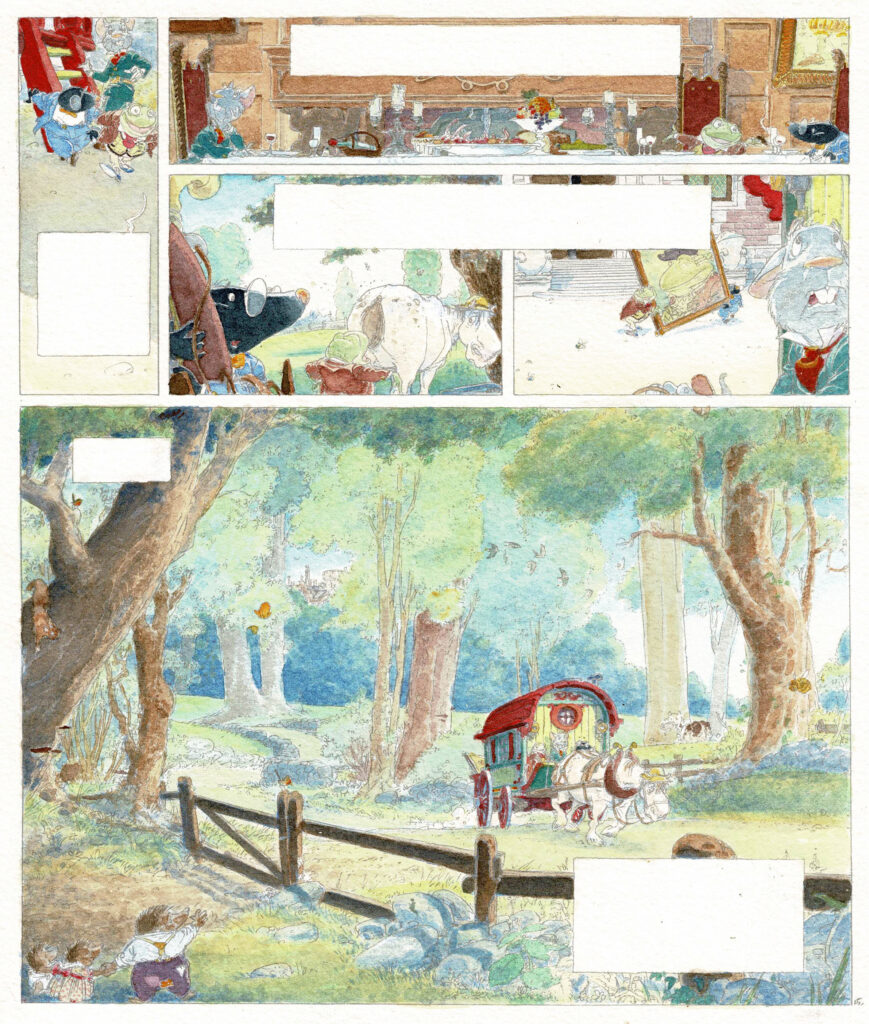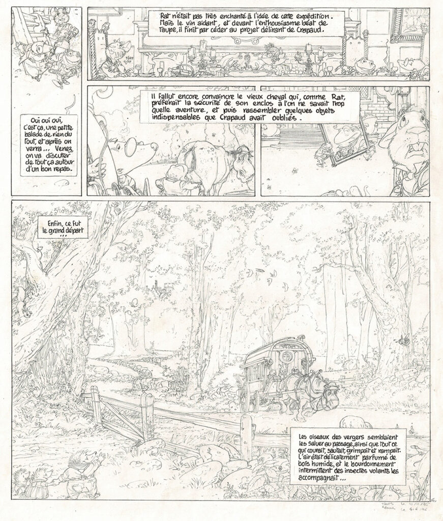 Le vent dans les saules, Le bois sauvage, planche originale à la mine de plomb pour cet album paru en 1996 chez Delcourt. On joint la mise en couleurs. Dimensions : 40 cm x 30 cm.