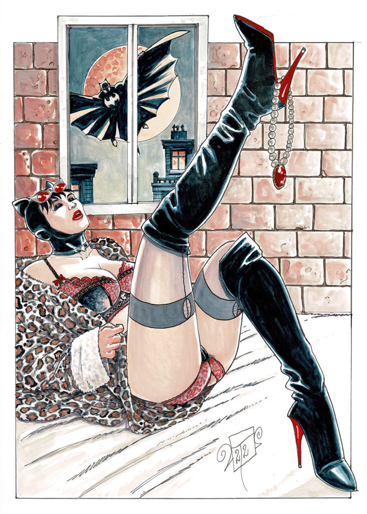 Catwoman, dessin original à l’encre de chine et à l’aquarelle. Dimensions : 41,5 cm x 29,5 cm.