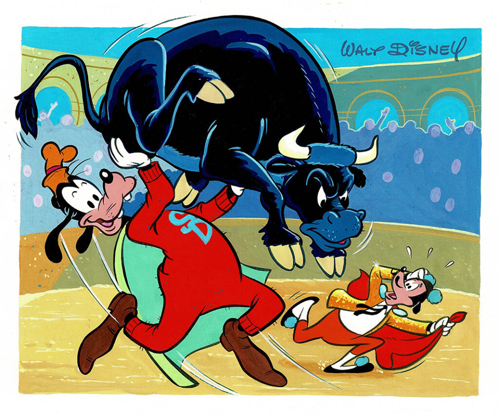 Dingo dans l’arène, couverture originale en couleurs directes réalisée pour le journal Mickey poche n¡ 119. Dimensions : 25,5 cm x 22 cm.