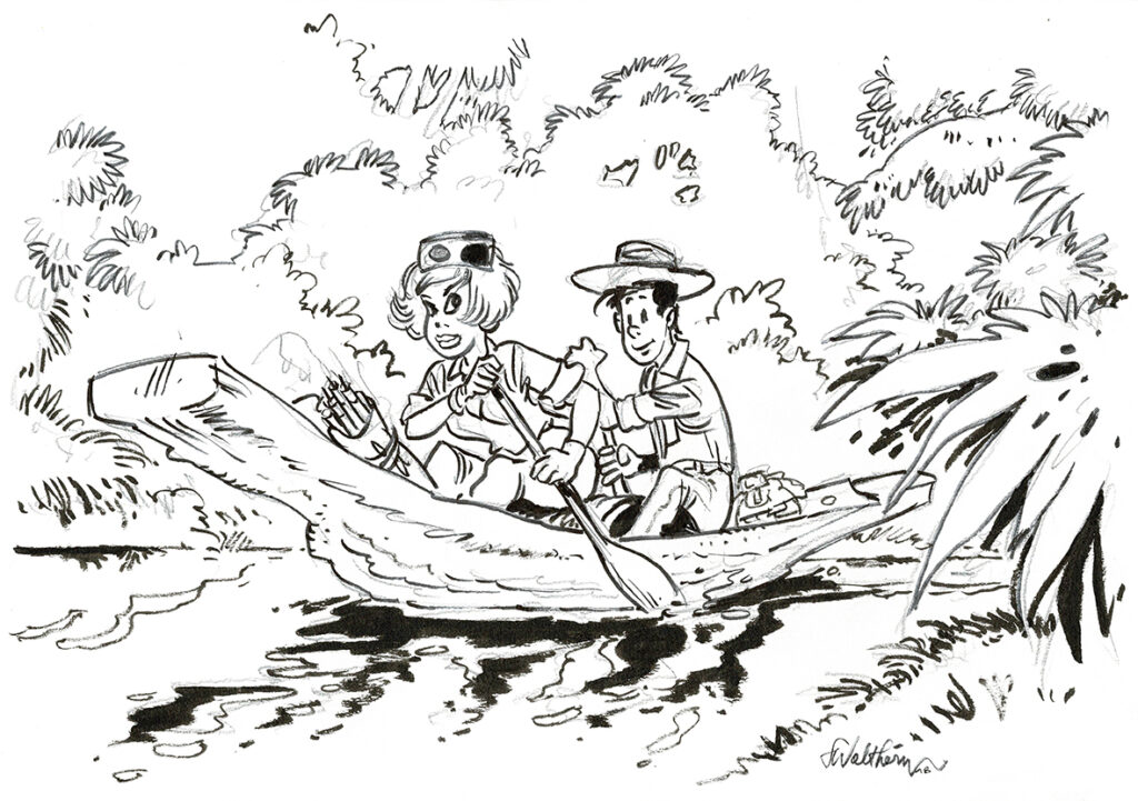 Natacha et Walter en pirogue, dessin original à l’encre de chine, cachet de Walthéry au verso. Dimensions : 42 cm x 29,5 cm.