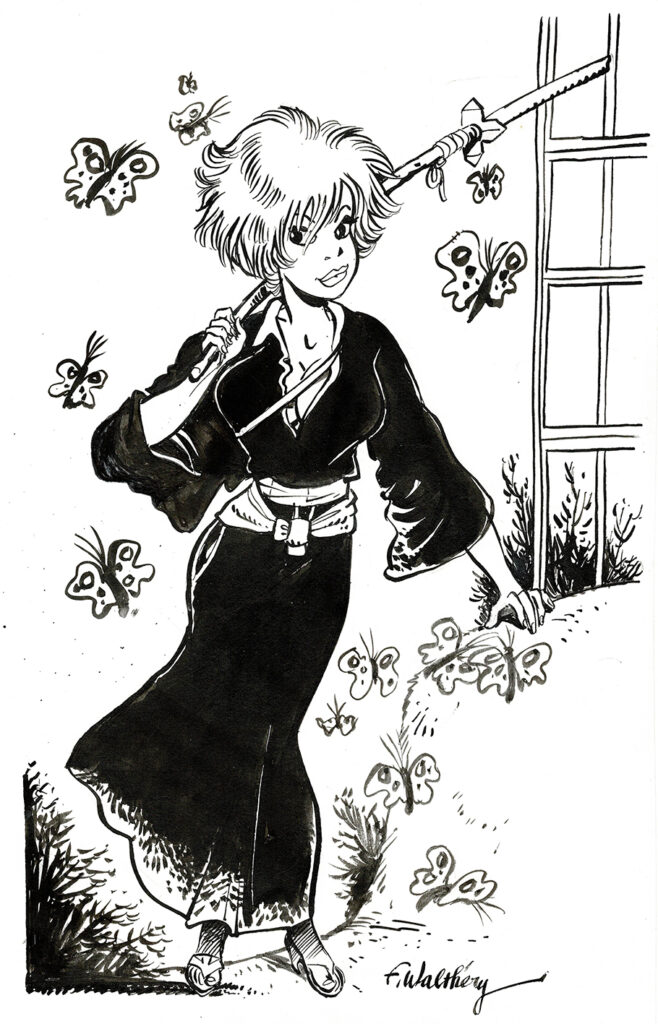 Natacha Samouraï, dessin original à l’encre de chine réalisé pour une sérigraphie parue chez Lorbaflo. Cachet de Walthéry au verso. Dimensions : 42 cm x 27,5 cm.