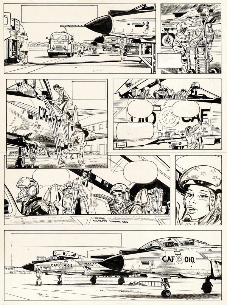 Dan Cooper, Azimut zéro, planche originale à l’encre de chine pour cet album paru en 1979 chez Fleurus. Dimensions : 48 cm x 36,5 cm.