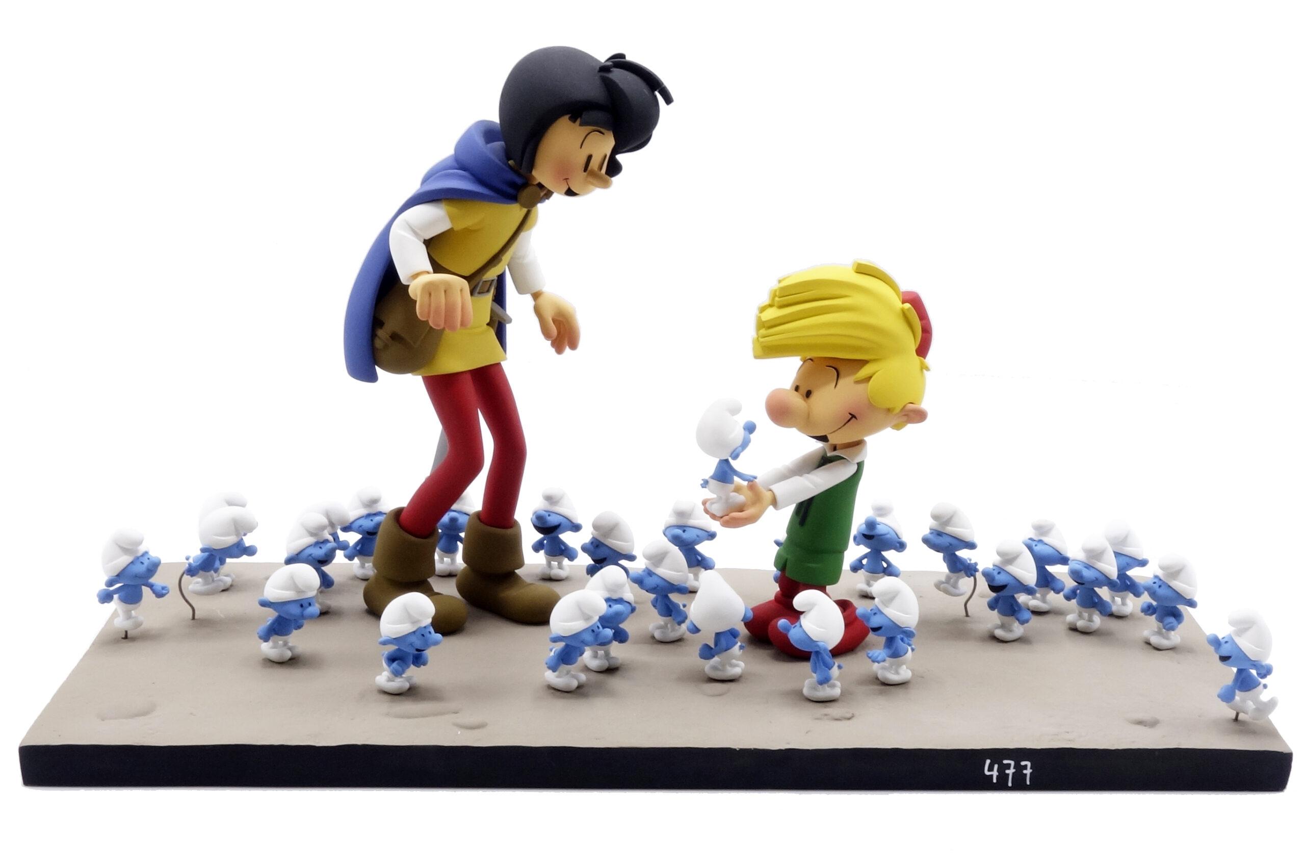 FARIBOLES : Johan et Pirlouit, lot de 3, la scène complète des retrouvailles, 2008, 2009, 2010, n°/500, 36 cm, 2x BC. Les personnages ont été fixés définitivement sur le socle. Envoi impossible !