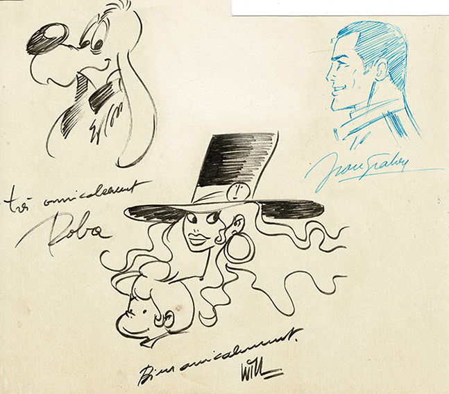 Ensemble de 3 dédicaces au feutre fin sur carton (Will, Roba et Graton). Dimensions : 28 cm x 25 cm.