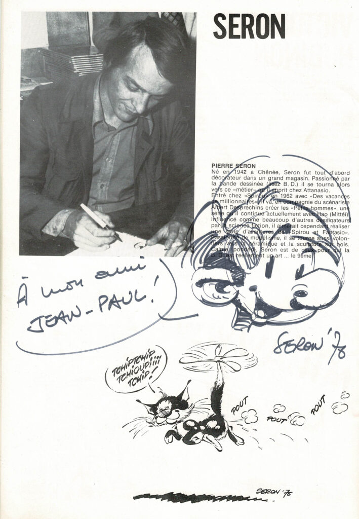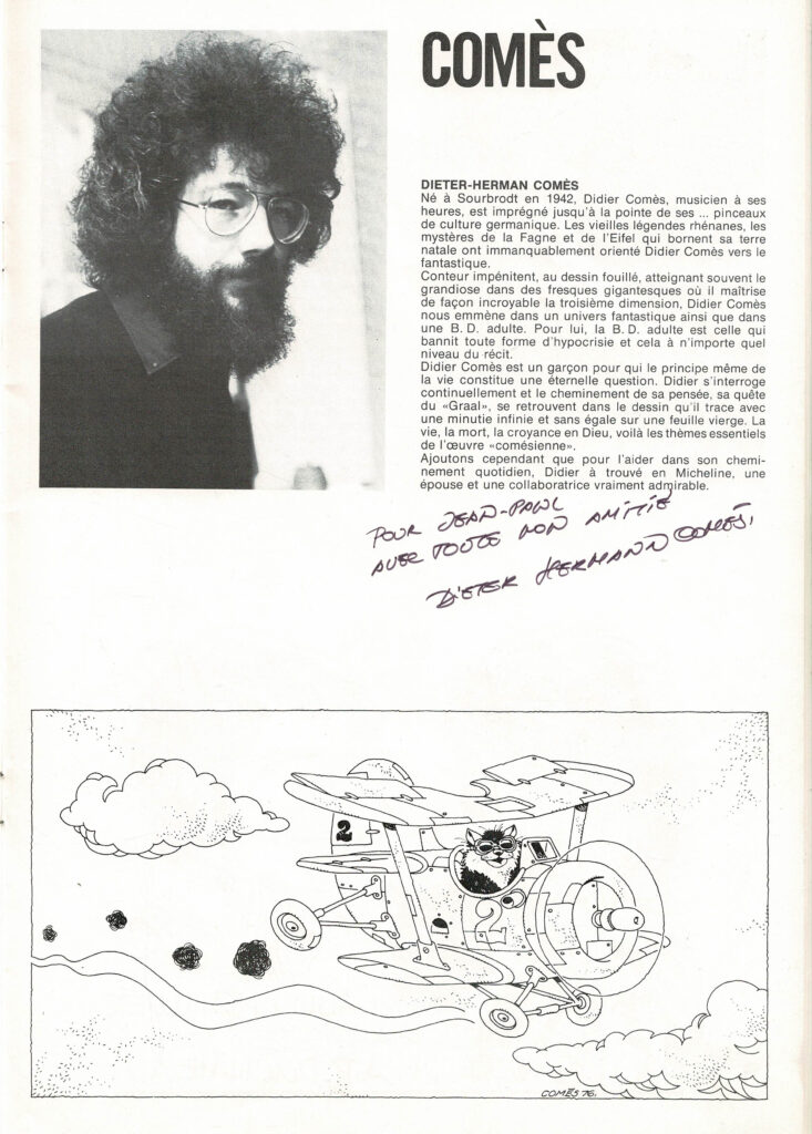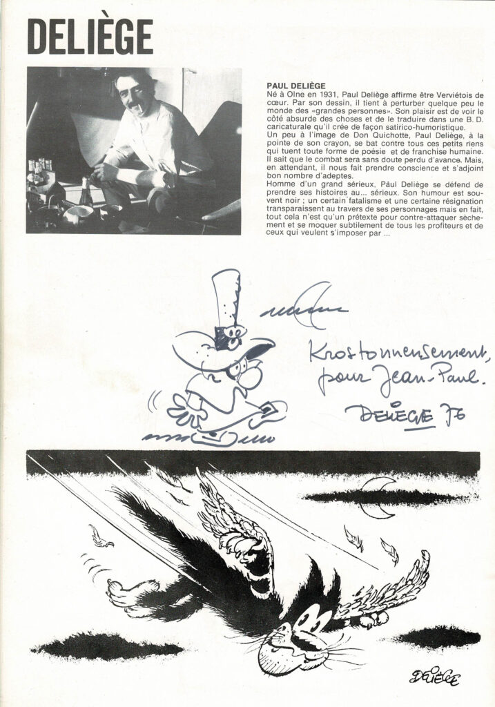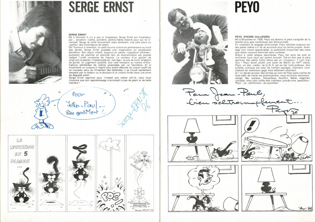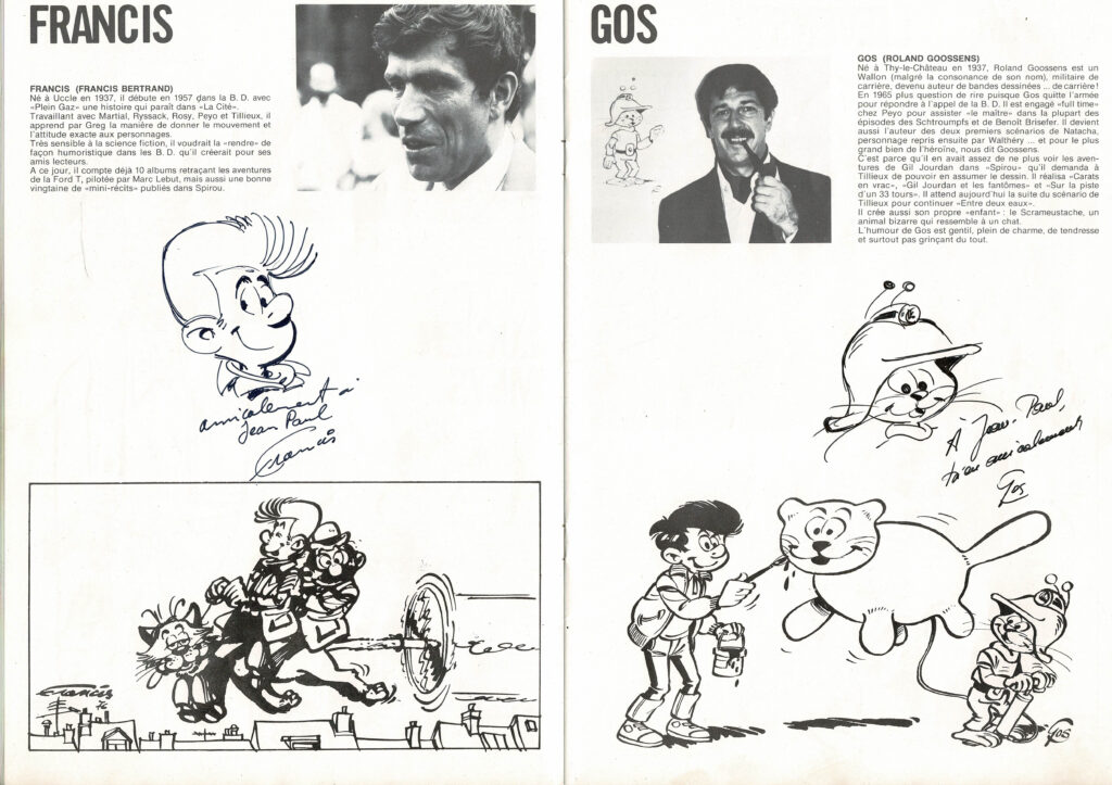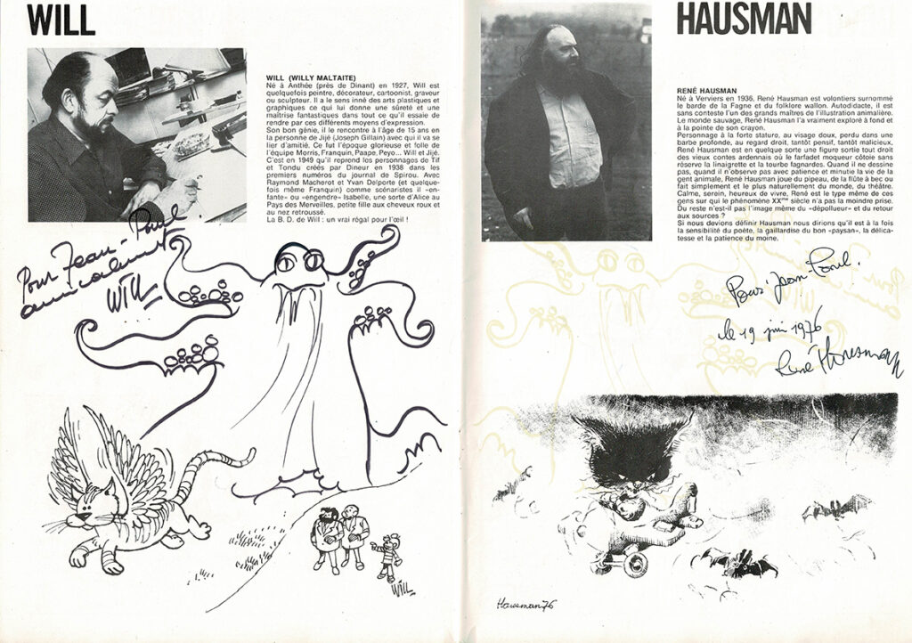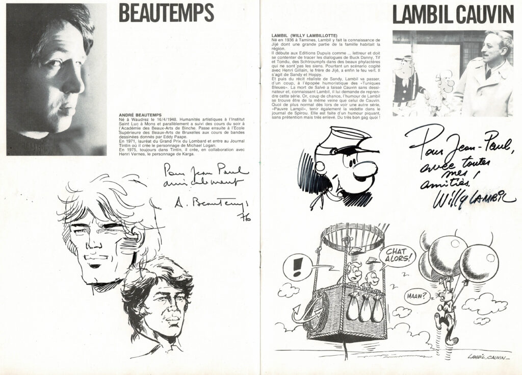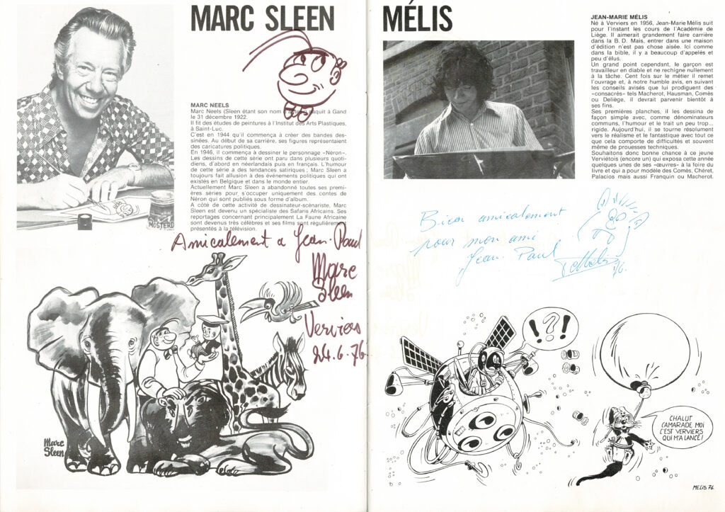 Programme du festival BD de Verviers de 1976 et son affiche, avec des dédicaces de Will 2x, Macherot, Hubinon, Leloup, Deliège, Francis 2x, Walthéry, Seron, Lambil 2x, Beautemps 2x, Gos 2x, Sleen 2x, Attanasio, Ernst, Devos 2x, Tibet, Piroton, Mélis. Egalement des signatures de Peyo, Hubinon, Carpentier, Leloup, Comès, Piroton Hausman et Jidéhem.